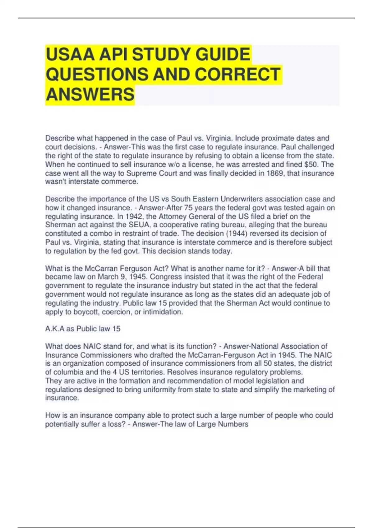 USAA API STUDY GUIDE QUESTIONS AND CORRECT ANSWERS Describe what happened in the case of Paul vs. Virginia. Include proximate dates and court decisions. - Answer-This was the first case to regulate insurance. Paul challenged the right of the state to regulate insurance by refusing to obtain a license from the state. When he continued to sell insurance w/o a license, he was arrested and fined $50. The case went all the way to Supreme Court and was finally decided in 1869, that insurance wasn't interstate commerce. Describe the importance of the US vs South Eastern Underwriters association case and how it changed insurance. - Answer-After 75 years the federal govt was tested again on regulating insurance. In 1942, the Attorney General of the US filed a brief on the Sherman act against the SEUA, a cooperative rating bureau, alleging that the bureau constituted a combo in restraint of trade. The decision (1944) reversed its decision of Paul vs. Virginia, stating that insurance is interstate commerce and is therefore subject to regulation by the fed govt. This decision stands today. What is the McCarran Ferguson Act? What is another name for it? - Answer-A bill that became law on March 9, 1945. Congress insisted that it was the right of the Federal government to regulate the insurance industry but stated in the act that the federal government would not regulate insurance as long as the states did an adequate job of regulating the industry. Public law 15 provided that the Sherman Act would continue to apply to boycott, coercion, or intimidation. A.K.A as Public law 15 What does NAIC stand for, and what is its function? - Answer-National Association of Insurance Commissioners who drafted the McCarran-Ferguson Act in 1945. The NAIC is an organization composed of insurance commissioners from all 50 states, the district of columbia and the 4 US territories. Resolves insurance regulatory problems. They are active in the formation and recommendation of model legislation and regulations designed to bring uniformity from state to state and simplify the marketing of insurance. How is an insurance company able to protect such a large number of people who could potentially suffer a loss? - Answer-The law of Large Numbers What does indemnify mean? - Answer-Also known as reimbursement) is a provision in an insurance policy that states that in the event of loss, an insured or a beneficiary is permitted to collect only to the extent of the financial loss, and isn't allowed to gain financially because of the existence of an insurance contract. The purpose of insurance is to restore, but not let an insured or a beneficiary profit from the loss. What are the elements of insurable risk? - Answer-1. Financial (a monetary interest) 2. Blood (a relative) 3. Business (a business partner) What are five methods of risk management? What are their definitions? - Answer- Avoidance - Eliminate exposure to a loss. (effective method) Retention - Planned assumption of risk by an insured through the use of deductibles, co-payments, or self-insurance. Retention is used to reduce expenses and improve cash flow. Also to Increase control of claim reserving and claims settlements and to fund for losses that can't be insured. Sharing - dealing w/risk for a group of people or businesses w/the same or similar exposure to loss to share the losses that occur within that group. Reduction - help detect problems early. Transfer - most effective way to handle risk. Loss is borne by another party. Name three sources of liability losses? - Answer-1. A court if it awards legal damages to a person from an organization responsible for negligently injuring that person. 2. The cost of a legal defense. 3. Loss prevention arising from potential legal liability. What are the 3 types of hazards? What are they? - Answer-Physical hazards are those arising from the material, structural, or operational features of the risk, apart from the persons owning or managing it. Moral hazards refers to those applicants that may lie on an app for insurance, or in the past, have submitted fraud claims against an insurer. Morale hazard refers to an increase in the hazard presented by a risk, arising from the insured's indifference to loss because of the existence of insurance. Explain the concept of adverse selection. - Answer-The insuring of risks that are more prone to losses than the average risk. Poorer risks tend to seek insurance or file claims to a greater extent than better risks. To protect themselves insurance companies have an option to refuse or restrict coverage for bad risks, or charge them a higher rate for insurance coverage. When studying groups, what happens to predictability when the size of the group increases? What does this tell us about any individual? - Answer- What is a contract and what is its purpose? - Answer-a document between a policyowner (and/or insured) and an insurance company which agrees to pay the insured or the beneficiary for loss caused by specific events. Describe the concept of consideration on the part of an insured and how it differs from consideration on the part of an insurer. - Answer-The consideration on the part of the insured is the payment of premium and the representations made in the app. The consideration on the part of the insurer is the promise to pay in the event of a loss. What is a fraternal benefit society? - Answer-An organization formed to provide insurance benefits for members of an affiliated lodge, religious organization, or fraternal organization with a representative form of government.