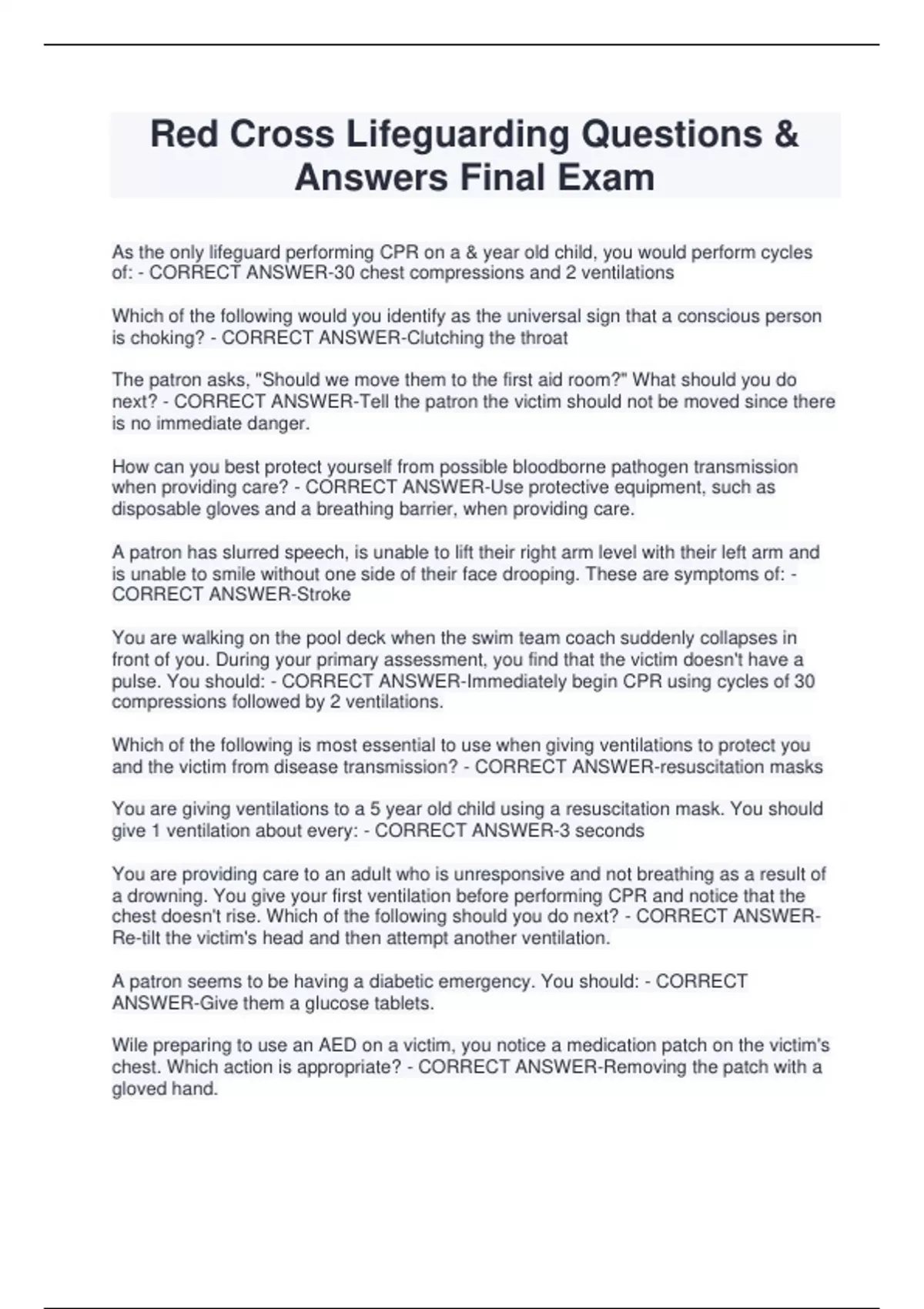 Red Cross Lifeguarding Questions & Answers Final Exam As the only lifeguard performing CPR on a & year old child, you would perform cycles of: - CORRECT ANSWER-30 chest compressions and 2 ventilations Which of the following would you identify as the universal sign that a conscious person is choking? - CORRECT ANSWER-Clutching the throat The patron asks, "Should we move them to the first aid room?" What should you do next? - CORRECT ANSWER-Tell the patron the victim should not be moved since there is no immediate danger. How can you best protect yourself from possible bloodborne pathogen transmission when providing care? - CORRECT ANSWER-Use protective equipment, such as disposable gloves and a breathing barrier, when providing care. A patron has slurred speech, is unable to lift their right arm level with their left arm and is unable to smile without one side of their face drooping. These are symptoms of: - CORRECT ANSWER-Stroke You are walking on the pool deck when the swim team coach suddenly collapses in front of you. During your primary assessment, you find that the victim doesn't have a pulse. You should: - CORRECT ANSWER-Immediately begin CPR using cycles of 30 compressions followed by 2 ventilations. Which of the following is most essential to use when giving ventilations to protect you and the victim from disease transmission? - CORRECT ANSWER-resuscitation masks You are giving ventilations to a 5 year old child using a resuscitation mask. You should give 1 ventilation about every: - CORRECT ANSWER-3 seconds You are providing care to an adult who is unresponsive and not breathing as a result of a drowning. You give your first ventilation before performing CPR and notice that the chest doesn't rise. Which of the following should you do next? - CORRECT ANSWERRe-tilt the victim's head and then attempt another ventilation. A patron seems to be having a diabetic emergency. You should: - CORRECT ANSWER-Give them a glucose tablets.