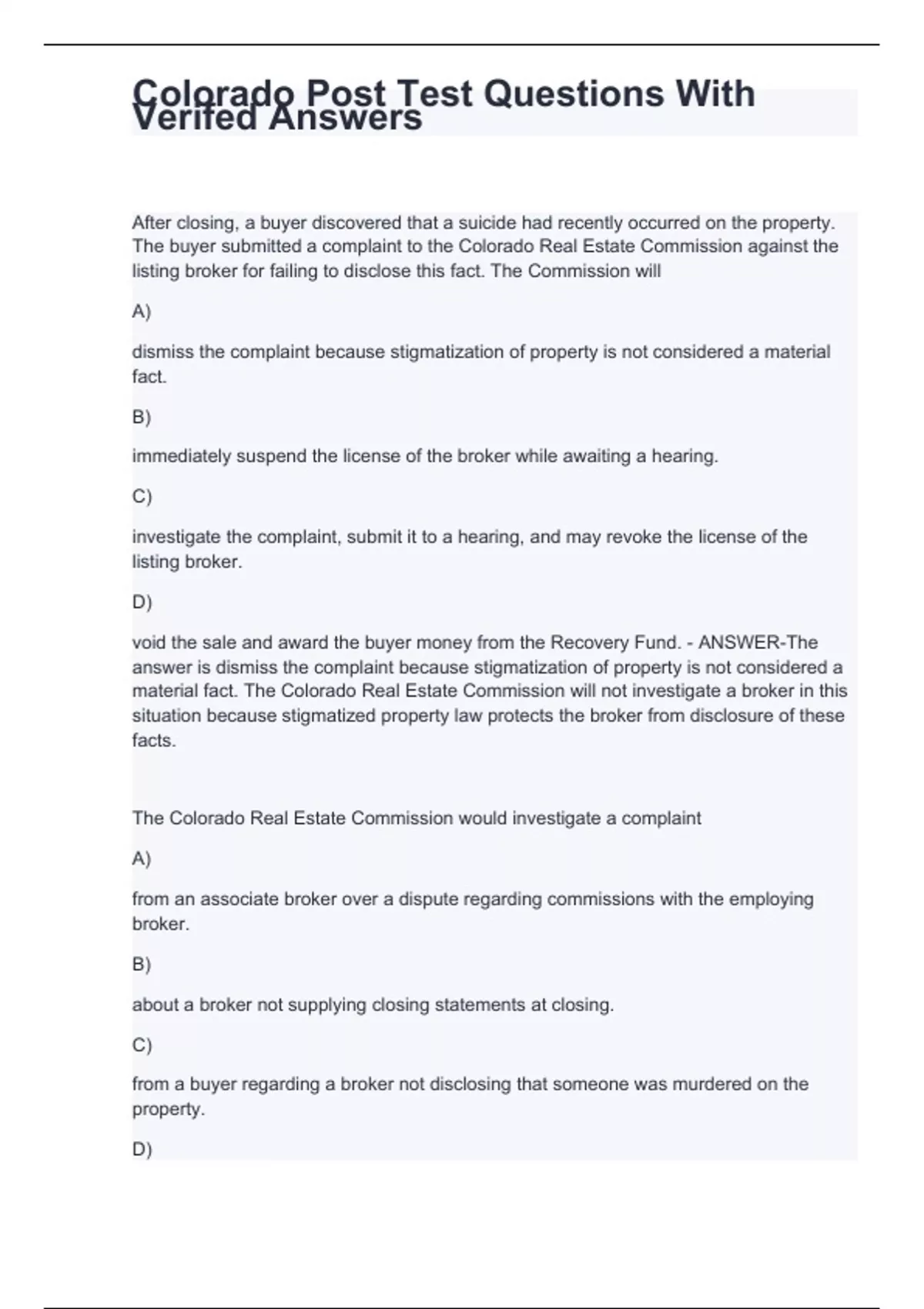 After closing, a buyer discovered that a suicide had recently occurred on the property. The buyer submitted a complaint to the Colorado Real Estate Commission against the listing broker for failing to disclose this fact. The Commission will A) dismiss the complaint because stigmatization of property is not considered a material fact. B) immediately suspend the license of the broker while awaiting a hearing. C) investigate the complaint, submit it to a hearing, and may revoke the license of the listing broker. D) void the sale and award the buyer money from the Recovery Fund. - ANSWER-The answer is dismiss the complaint because stigmatization of property is not considered a material fact. The Colorado Real Estate Commission will not investigate a broker in this situation because stigmatized property law protects the broker from disclosure of these facts. The Colorado Real Estate Commission would investigate a complaint A) from an associate broker over a dispute regarding commissions with the employing broker. B) about a broker not supplying closing statements at closing. C) from a buyer regarding a broker not disclosing that someone was murdered on the property.