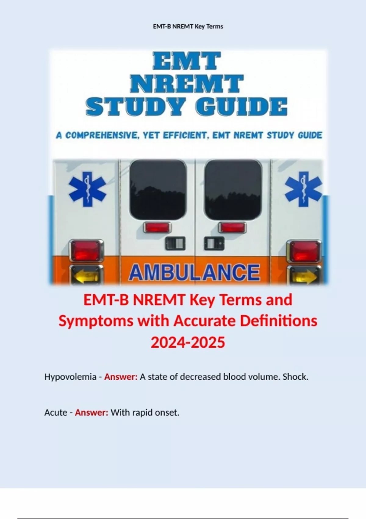 EMT-B NREMT Key Terms and Symptoms with Accurate Definitions . Contains Terms like: Hypovolemia - Answer: A state of decreased blood volume. Shock.