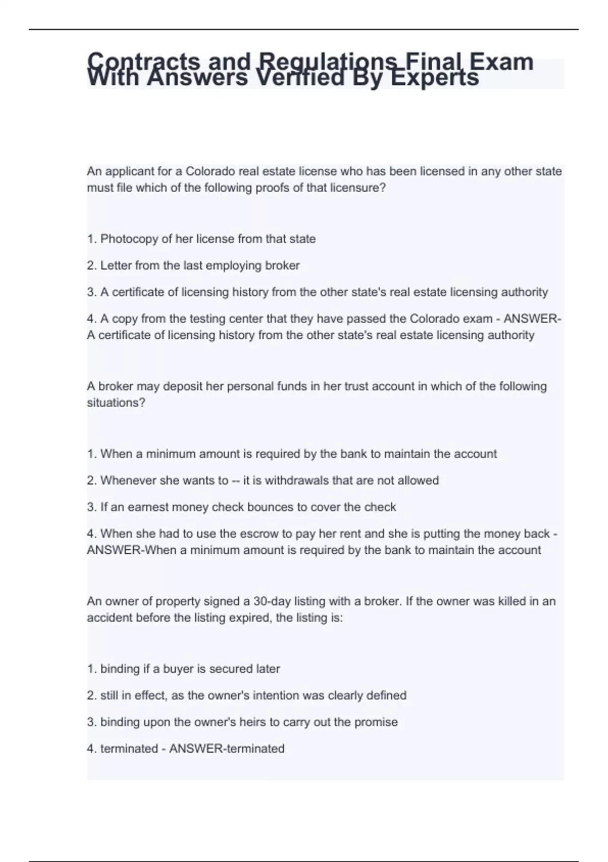 An applicant for a Colorado real estate license who has been licensed in any other state must file which of the following proofs of that licensure? 1. Photocopy of her license from that state 2. Letter from the last employing broker 3. A certificate of licensing history from the other state's real estate licensing authority 4. A copy from the testing center that they have passed the Colorado exam - ANSWER-A certificate of licensing history from the other state's real estate licensing authority A broker may deposit her personal funds in her trust account in which of the following situations? 1. When a minimum amount is required by the bank to maintain the account 2. Whenever she wants to -- it is withdrawals that are not allowed 3. If an earnest money check bounces to cover the check 4. When she had to use the escrow to pay her rent and she is putting the money back - ANSWER-When a minimum amount is required by the bank to maintain the account An owner of property signed a 30-day listing with a broker. If the owner was killed in an accident before the listing expired, the listing is: 1. binding if a buyer is secured later 2. still in effect, as the owner's intention was clearly defined 3. binding upon the owner's heirs to carry out the promise 4. terminated - ANSWER-terminated Broker Mary Andrews took a listing and later discovered that her client had previously been declared incompetent by a court of law. The listing is now: 1. Is binding, since the broker was acting as the owner's agent in good faith 2. Is void 3. Is the basis for the recovery of a commission if the broker produces a buyer 4. Is voidable - ANSWER-Is void If a broker holds a purchase option as well as the listing and decides to exercise his option, he must: