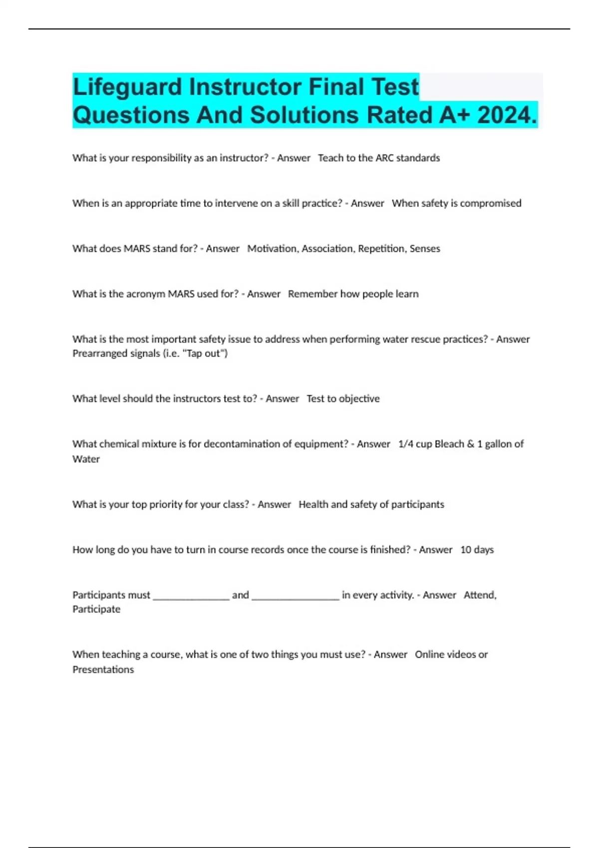 Lifeguard Instructor Final Test Questions And Solutions Rated A+ 2024.