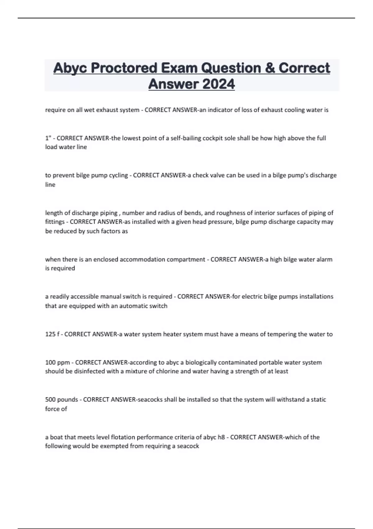 Abyc Proctored Exam Question & Correct Answer 2024 require on all wet exhaust system - CORRECT ANSWER-an indicator of loss of exhaust cooling water is 1" - CORRECT ANSWER-the lowest point of a self-bailing cockpit sole shall be how high above the full load water line to prevent bilge pump cycling - CORRECT ANSWER-a check valve can be used in a bilge pump's discharge line length of discharge piping , number and radius of bends, and roughness of interior surfaces of piping of fittings - CORRECT ANSWER-as installed with a given head pressure, bilge pump discharge capacity may be reduced by such factors as