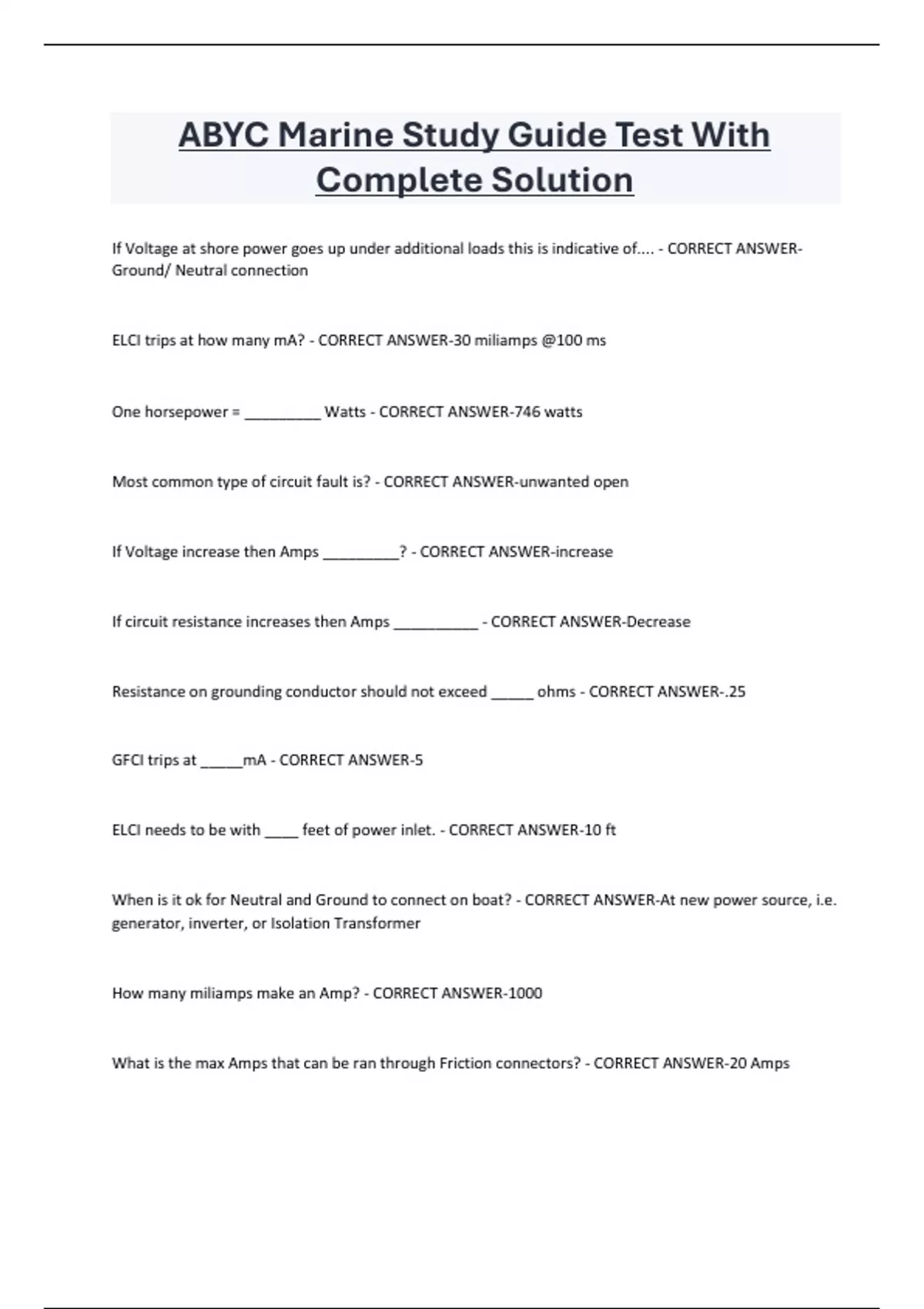 ABYC Marine Study Guide Test With Complete Solution If Voltage at shore power goes up under additional loads this is indicative of.... - CORRECT ANSWERGround/ Neutral connection ELCI trips at how many mA? - CORRECT ANSWER-30 miliamps @100 ms One horsepower = _________ Watts - CORRECT ANSWER-746 watts Most common type of circuit fault is? - CORRECT ANSWER-unwanted open