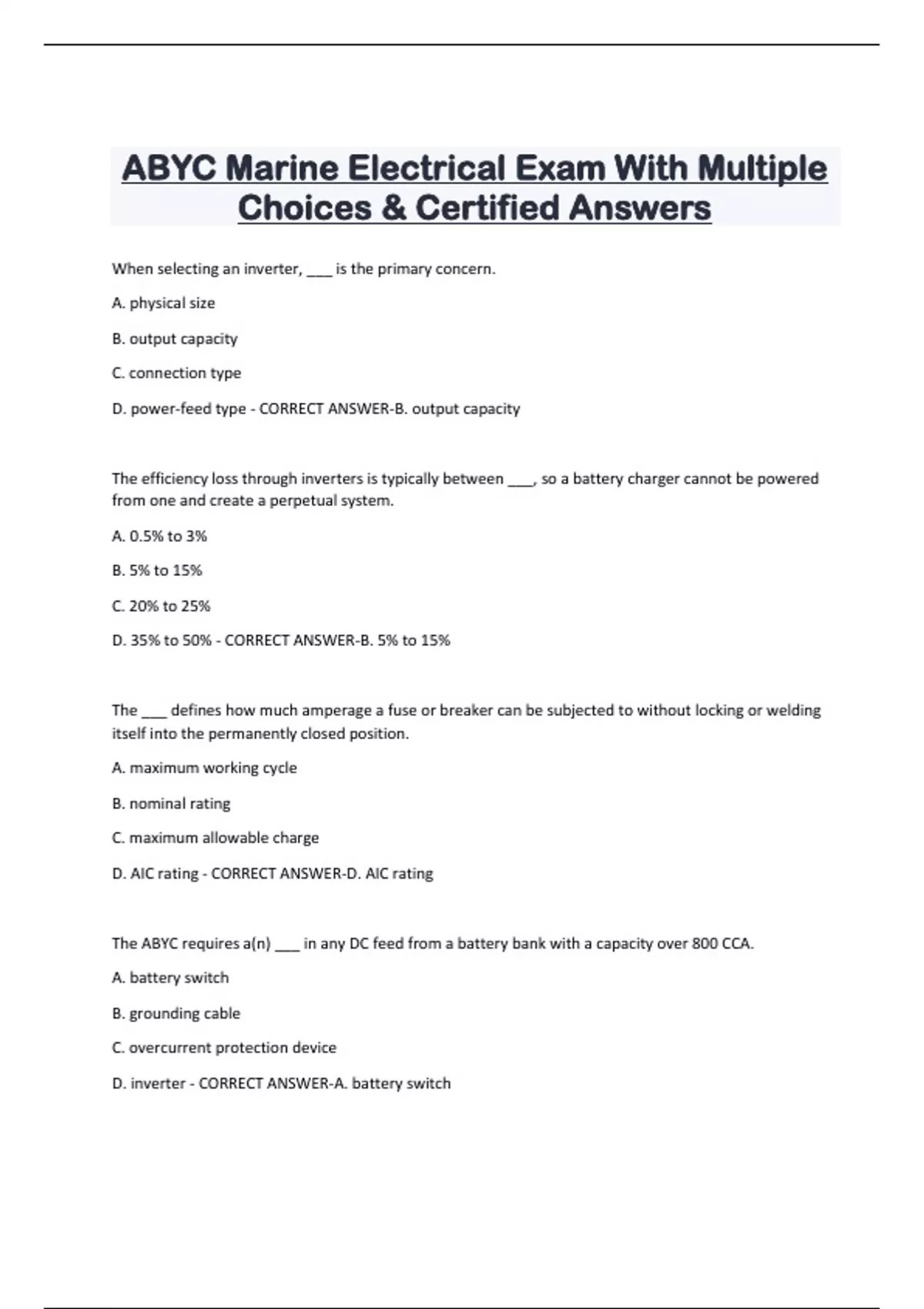 ABYC Marine Electrical Exam With Multiple Choices & Certified Answers When selecting an inverter, ___ is the primary concern. A. physical size B. output capacity C. connection type D. power-feed type - CORRECT ANSWER-B. output capacity The efficiency loss through inverters is typically between ___, so a battery charger cannot be powered from one and create a perpetual system. A. 0.5% to 3% B. 5% to 15% C. 20% to 25% D. 35% to 50% - CORRECT ANSWER-B. 5% to 15