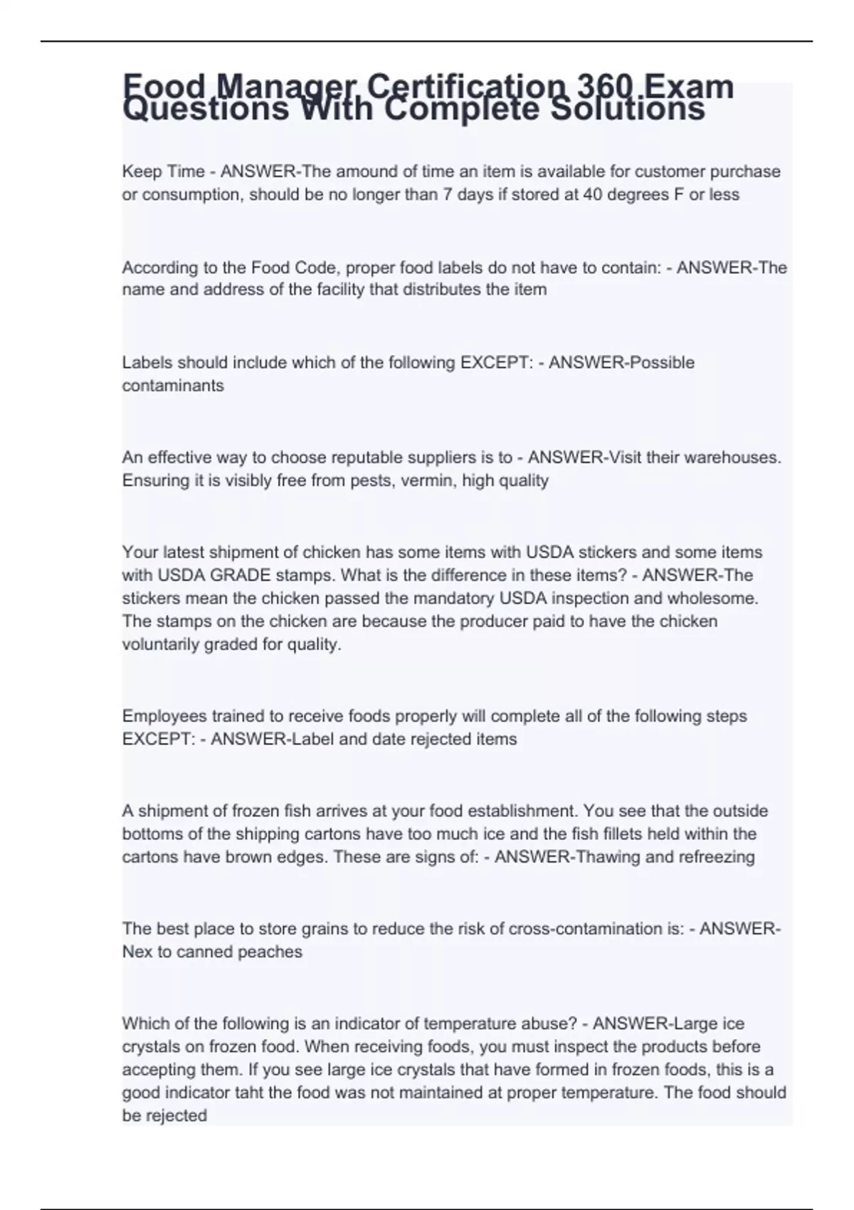 Keep Time - ANSWER-The amound of time an item is available for customer purchase or consumption, should be no longer than 7 days if stored at 40 degrees F or less According to the Food Code, proper food labels do not have to contain: - ANSWER-The name and address of the facility that distributes the item Labels should include which of the following EXCEPT: - ANSWER-Possible contaminants An effective way to choose reputable suppliers is to - ANSWER-Visit their warehouses. Ensuring it is visibly free from pests, vermin, high quality Your latest shipment of chicken has some items with USDA stickers and some items with USDA GRADE stamps. What is the difference in these items? - ANSWER-The stickers mean the chicken passed the mandatory USDA inspection and wholesome. The stamps on the chicken are because the producer paid to have the chicken voluntarily graded for quality. Employees trained to receive foods properly will complete all of the following steps EXCEPT: - ANSWER-Label and date rejected items A shipment of frozen fish arrives at your food establishment. You see that the outside bottoms of the shipping cartons have too much ice and the fish fillets held within the cartons have brown edges. These are signs of: - ANSWER-Thawing and refreezing The best place to store grains to reduce the risk of cross-contamination is: - ANSWER-Nex to canned peaches