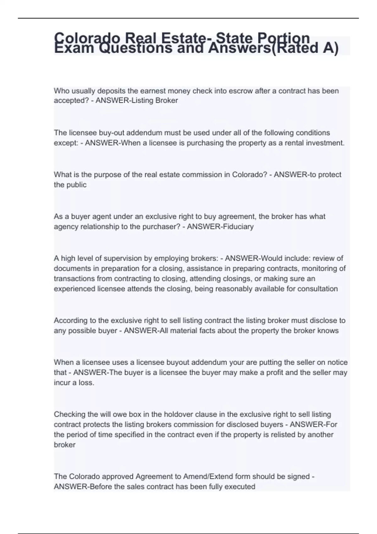 Who usually deposits the earnest money check into escrow after a contract has been accepted? - ANSWER-Listing Broker The licensee buy-out addendum must be used under all of the following conditions except: - ANSWER-When a licensee is purchasing the property as a rental investment. What is the purpose of the real estate commission in Colorado? - ANSWER-to protect the public As a buyer agent under an exclusive right to buy agreement, the broker has what agency relationship to the purchaser? - ANSWER-Fiduciary A high level of supervision by employing brokers: - ANSWER-Would include: review of documents in preparation for a closing, assistance in preparing contracts, monitoring of transactions from contracting to closing, attending closings, or making sure an experienced licensee attends the closing, being reasonably available for consultation According to the exclusive right to sell listing contract the listing broker must disclose to any possible buyer - ANSWER-All material facts about the property the broker knows When a licensee uses a licensee buyout addendum your are putting the seller on notice that - ANSWER-The buyer is a licensee the buyer may make a profit and the seller may incur a loss. Checking the will owe box in the holdover clause in the exclusive right to sell listing contract protects the listing brokers commission for disclosed buyers - ANSWER-For the period of time specified in the contract even if the property is relisted by another broker
