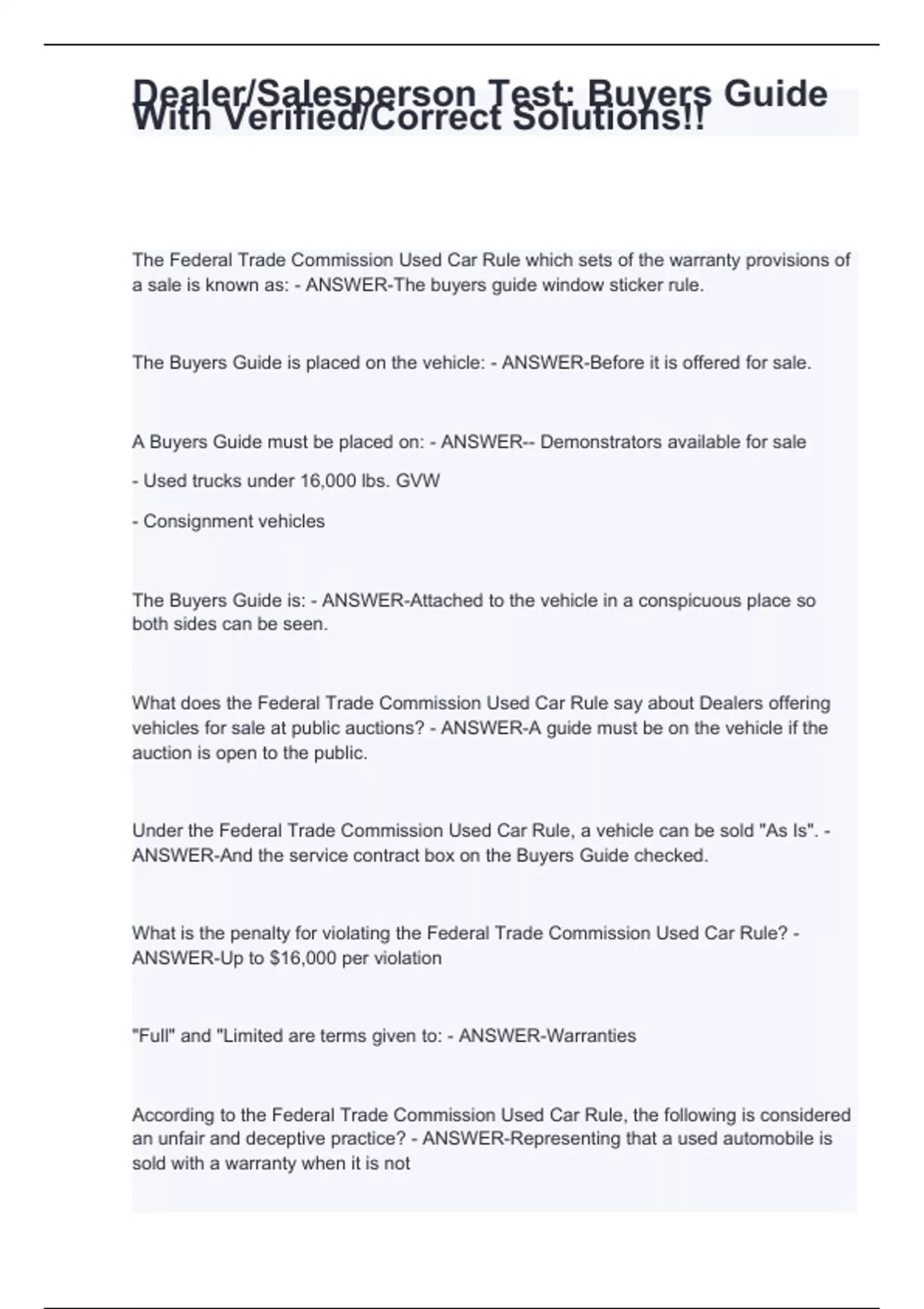 The Federal Trade Commission Used Car Rule which sets of the warranty provisions of a sale is known as: - ANSWER-The buyers guide window sticker rule. The Buyers Guide is placed on the vehicle: - ANSWER-Before it is offered for sale. A Buyers Guide must be placed on: - ANSWER-- Demonstrators available for sale - Used trucks under 16,000 lbs. GVW - Consignment vehicles The Buyers Guide is: - ANSWER-Attached to the vehicle in a conspicuous place so both sides can be seen. What does the Federal Trade Commission Used Car Rule say about Dealers offering vehicles for sale at public auctions? - ANSWER-A guide must be on the vehicle if the auction is open to the public. Under the Federal Trade Commission Used Car Rule, a vehicle can be sold "As Is". - ANSWER-And the service contract box on the Buyers Guide checked.