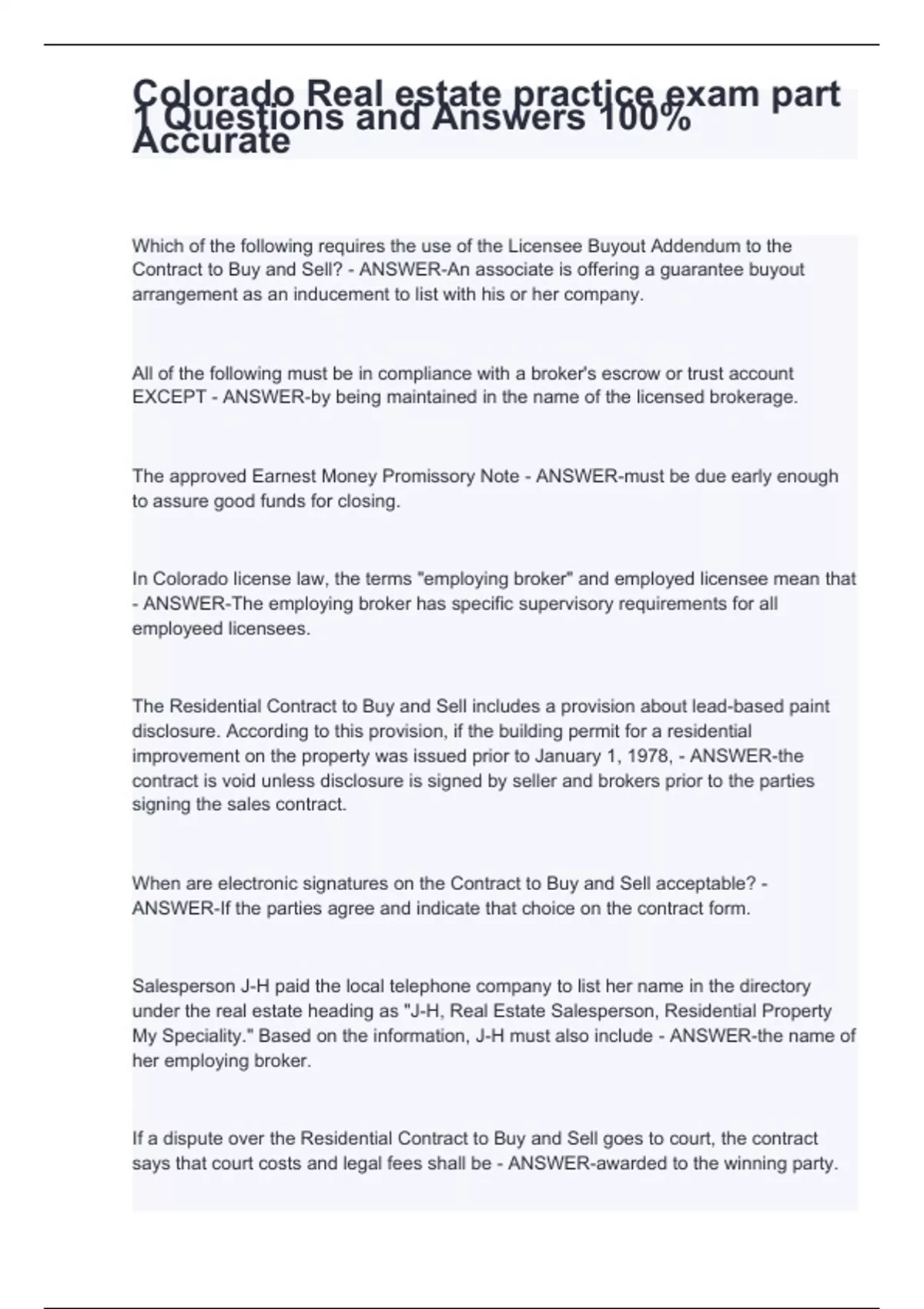 All of the following must be in compliance with a broker's escrow or trust account EXCEPT - ANSWER-by being maintained in the name of the licensed brokerage. The approved Earnest Money Promissory Note - ANSWER-must be due early enough to assure good funds for closing. In Colorado license law, the terms "employing broker" and employed licensee mean that - ANSWER-The employing broker has specific supervisory requirements for all employeed licensees. The Residential Contract to Buy and Sell includes a provision about lead-based paint disclosure. According to this provision, if the building permit for a residential improvement on the property was issued prior to January 1, 1978, - ANSWER-the contract is void unless disclosure is signed by seller and brokers prior to the parties signing the sales contract. When are electronic signatures on the Contract to Buy and Sell acceptable? - ANSWER-If the parties agree and indicate that choice on the contract form. Salesperson J-H paid the local telephone company to list her name in the directory under the real estate heading as "J-H, Real Estate Salesperson, Residential Property My Speciality." Based on the information, J-H must also include - ANSWER-the name of her employing broker.