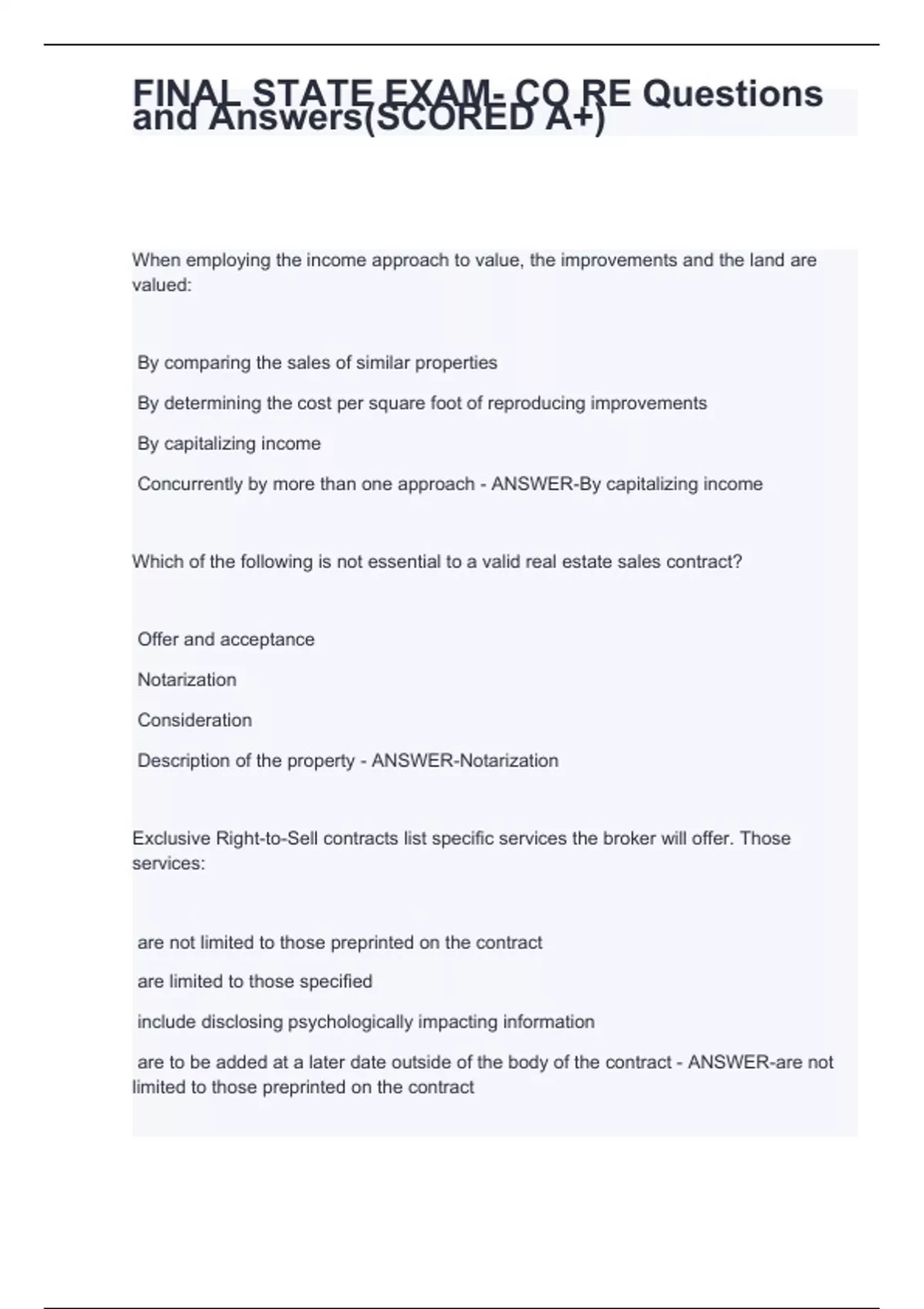 When employing the income approach to value, the improvements and the land are valued: By comparing the sales of similar properties By determining the cost per square foot of reproducing improvements By capitalizing income Concurrently by more than one approach - ANSWER-By capitalizing income Which of the following is not essential to a valid real estate sales contract? Offer and acceptance Notarization Consideration Description of the property - ANSWER-Notarization Exclusive Right-to-Sell contracts list specific services the broker will offer. Those services: are not limited to those preprinted on the contract are limited to those specified include disclosing psychologically impacting information are to be added at a later date outside of the body of the contract - ANSWER-are not limited to those preprinted on the contract Brokers may not disclose any psychologically impacting information; each listing contract must contain all services/requirements of each party to the contract. Other services may be added in the additional provisions section.