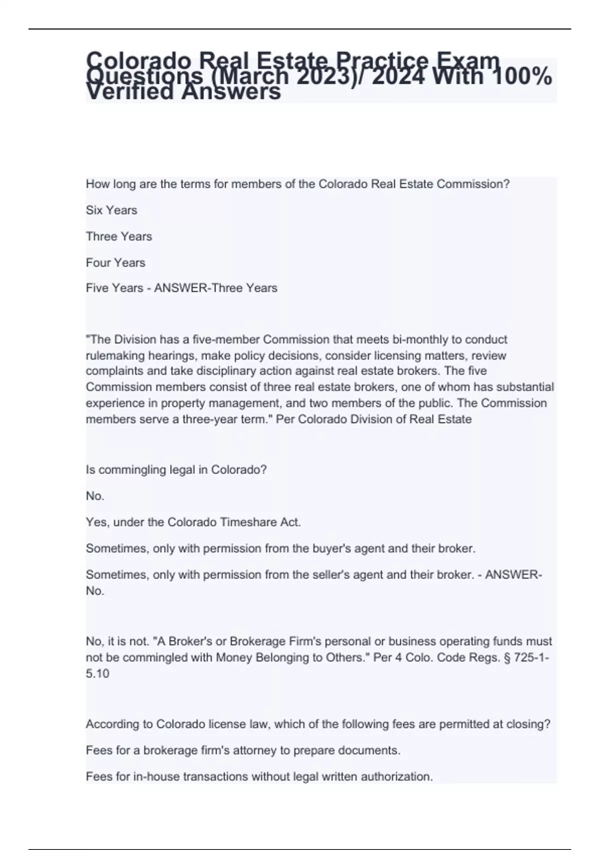 According to Colorado license law, which of the following fees are permitted at closing?