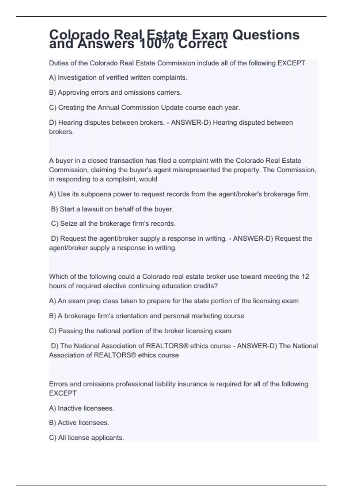 Duties of the Colorado Real Estate Commission include all of the following EXCEPT A) Investigation of verified written complaints. B) Approving errors and omissions carriers. C) Creating the Annual Commission Update course each year. D) Hearing disputes between brokers. - ANSWER-D) Hearing disputed between brokers. A buyer in a closed transaction has filed a complaint with the Colorado Real Estate Commission, claiming the buyer's agent misrepresented the property. The Commission, in responding to a complaint, would A) Use its subpoena power to request records from the agent/broker's brokerage firm. B) Start a lawsuit on behalf of the buyer. C) Seize all the brokerage firm's records. D) Request the agent/broker supply a response in writing. - ANSWER-D) Request the agent/broker supply a response in writing. Which of the following could a Colorado real estate broker use toward meeting the 12 hours of required elective continuing education credits? A) An exam prep class taken to prepare for the state portion of the licensing exam B) A brokerage firm's orientation and personal marketing course C) Passing the national portion of the broker licensing exam D) The National Association of REALTORS® ethics course - ANSWER-D) The National Association of REALTORS® ethics course Errors and omissions professional liability insurance is required for all of the following EXCEPT A) Inactive licensees. B) Active licensees. C) All license applicants. D) Employing brokers. - ANSWER-A) Inactive licensees. A broker completed all of her required continuing education, but 15 days after her anniversary date, she still has not paid renewal fees for her license. What is the current status of her license? A) Inactive and may not sell real estate B) Active but may not sell real estate C) Expired D) Active and may sell real estate if she pays within 30 days - ANSWER-B) Active but may not sell real estate