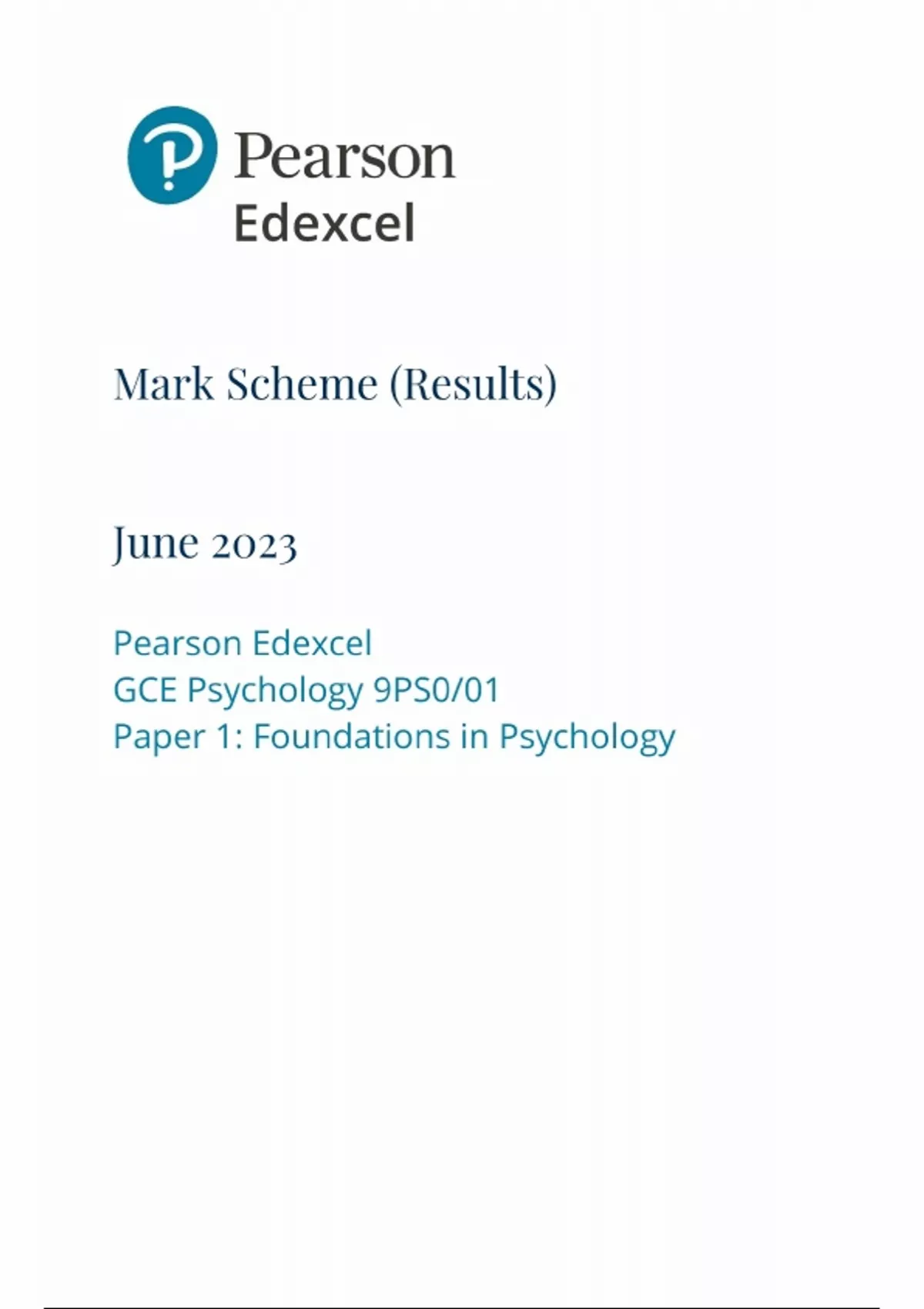 2023 PEARSON EDEXCEL GCE PSYCHOLOGY MARK SCHEME PAPER 1 [9PS0/01: Foundations in Psychology]