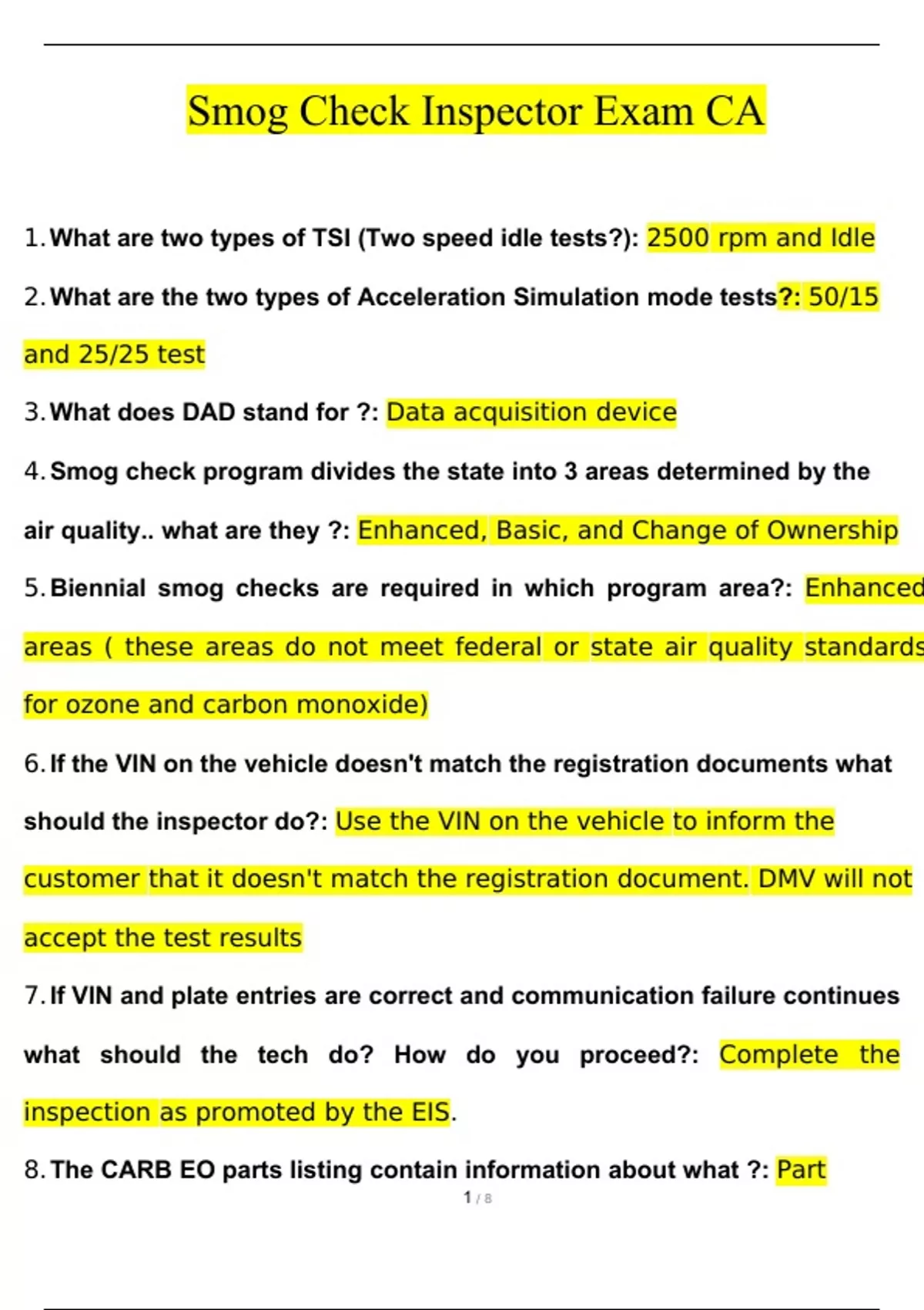 Smog Check Inspector Exam CA Actual Questions and Answers (2024 / 2025) (Verified Answers)