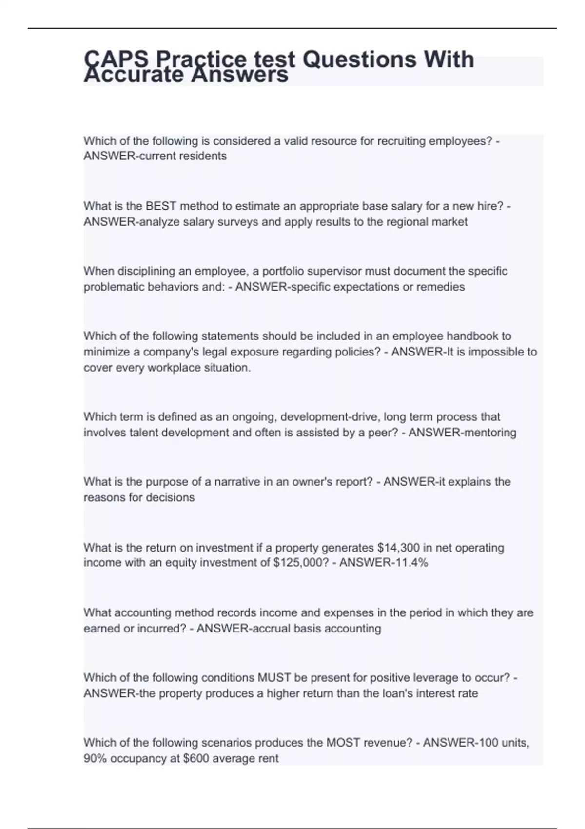 What is the BEST method to estimate an appropriate base salary for a new hire? - ANSWER-analyze salary surveys and apply results to the regional market When disciplining an employee, a portfolio supervisor must document the specific problematic behaviors and: - ANSWER-specific expectations or remedies Which of the following statements should be included in an employee handbook to minimize a company's legal exposure regarding policies? - ANSWER-It is impossible to cover every workplace situation. Which term is defined as an ongoing, development-drive, long term process that involves talent development and often is assisted by a peer? - ANSWER-mentoring What is the purpose of a narrative in an owner's report? - ANSWER-it explains the reasons for decisions What is the return on investment if a property generates $14,300 in net operating income with an equity investment of $125,000? - ANSWER-11.4% What accounting method records income and expenses in the period in which they are earned or incurred? - ANSWER-accrual basis accounting Which of the following conditions MUST be present for positive leverage to occur? - ANSWER-the property produces a higher return than the loan's interest rate