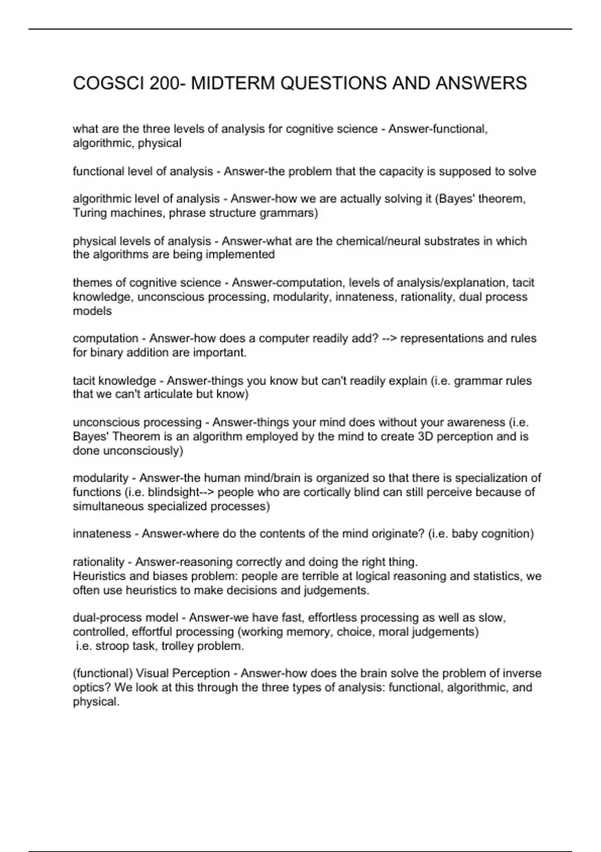 COGSCI 200- MIDTERM QUESTIONS AND ANSWERS
