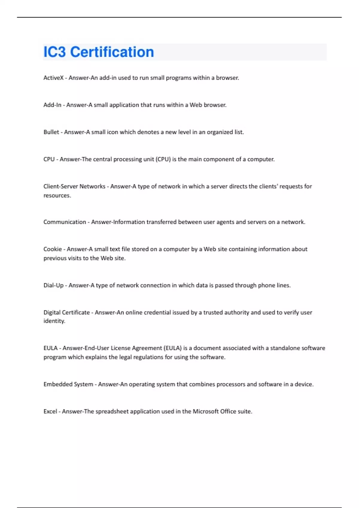 ActiveX - Answer-An add-in used to run small programs within a browser. Add-In - Answer-A small application that runs within a Web browser. Bullet - Answer-A small icon which denotes a new level in an organized list. CPU - Answer-The central processing unit (CPU) is the main component of a computer. Client-Server Networks - Answer-A type of network in which a server directs the clients' requests for resources. Communication - Answer-Information transferred between user agents and servers on a network. Cookie - Answer-A small text file stored on a computer by a Web site containing information about previous visits to the Web site. Dial-Up - Answer-A type of network connection in which data is passed through phone lines. Digital Certificate - Answer-An online credential issued by a trusted authority and used to verify user identity. EULA - Answer-End-User License Agreement (EULA) is a document associated with a standalone software program which explains the legal regulations for using the software. Embedded System - Answer-An operating system that combines processors and software in a device. Excel - Answer-The spreadsheet application used in the Microsoft Office suite.Extranet - Answer-A private network that an organization uses to communicate and share data with customers or partners. FTP - Answer-File Transfer Protocol (FTP) is a protocol used to move files and folders over a network or the Internet. Filtering Software - Answer-A program used to prevent a user from going to certain Web sites that may be inappropriate. Firewall - Answer-Hardware or software used to protect data by determining what can get in and out of a network Flaming - Answer-Hostile and insulting interaction between Internet users. Footer - Answer-The bottom portion of a document which may contain information such as title author page number or file name. Format - Answer-The act of modifying the appearance of text and other. Format Painter - Answer-A tool used in Microsoft Office applications which applies the formatting of a selected area to other areas. Freeware - Answer-Software that is available to use without cost. HTML - Answer-Hypertext Markup Language (HTML) is the language used to format text and other elements of a Web page. HTTP - Answer-Hypertext Transport Protocol (HTTP) is a protocol that transmits requests and data between user agents and Web servers. HTTPS - Answer-Secure Hypertext Transport Protocol (HTTPS) is the encryption protocol used to transmit requests and data between agents and Web servers.Hard Drive - Answer-The primary storage component of a computer which holds all software and data. Header - Answer-The uppermost portion of a document which may contain information such as title author page number or file name. IP Address - Answer-A numerical address that identifies computers and devices on a network. ISP - Answer-Internet Service Provider (ISP) is a company that provides customers access to the Internet