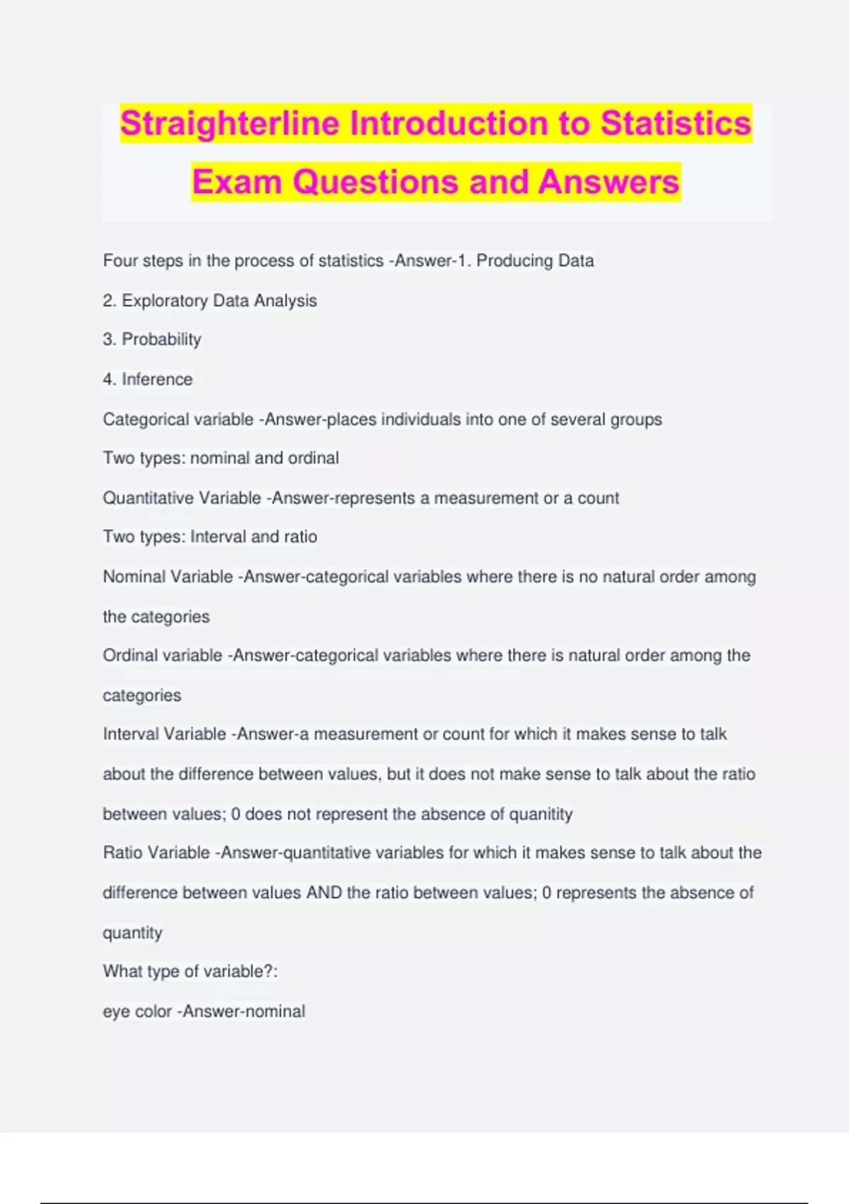 Straighterline Introduction to Statistics Exam Questions and Answers Four steps in the process of statistics -Answer-1. Producing Data 2. Exploratory Data Analysis 3. Probability 4. Inference Categorical variable -Answer-places individuals into one of several groups Two types: nominal and ordinal Quantitative Variable -Answer-represents a measurement or a count Two types: Interval and ratio Nominal Variable -Answer-categorical variables where there is no natural order among the categories Ordinal variable -Answer-categorical variables where there is natural order among the categories Interval Variable -Answer-a measurement or count for which it makes sense to talk about the difference between values, but it does not make sense to talk about the ratio between values; 0 does not represent the absence of quanitity Ratio Variable -Answer-quantitative variables for which it makes sense to talk about the difference between values AND the ratio between values; 0 represents the absence of quantity What type of variable?: eye color -Answer-nominal What type of variable?: socioeconomic status with categories low, med, high -Answer-Ordinal What type of variable?: Temperature -Answer-Interval What type of variable?: Income -Answer-Ratio Visual display and numerical summary for a single categorical variable -Answer-pie chart or bar chart and category percentages Visual display and numerical summary for a single quantitative variable -Answer- histogram or stemplot and descriptive statistics Visual display and numerical summary for C->C -Answer-Two way table and conditional percentages Visual display and numerical summary for C->Q -Answer-Side by side box plots and descriptive statistics Visual display and numerical summary for Q->Q -Answer-Scatterplot and correlation coefficient (r) Standard Deviation Rule -Answer-Approximately 68% of observations fall within 1 sd of the mean