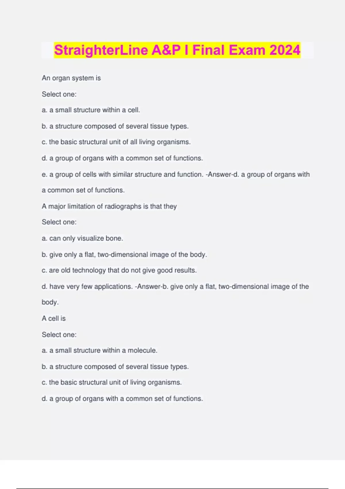 StraighterLine A&P I Final Exam 2024 An organ system is Select one: a. a small structure within a cell. b. a structure composed of several tissue types. c. the basic structural unit of all living organisms. d. a group of organs with a common set of functions. e. a group of cells with similar structure and function. -Answer-d. a group of organs with a common set of functions. A major limitation of radiographs is that they Select one: a. can only visualize bone. b. give only a flat, two-dimensional image of the body. c. are old technology that do not give good results. d. have very few applications. -Answer-b. give only a flat, two-dimensional image of the body. A cell is Select one: a. a small structure within a molecule. b. a structure composed of several tissue types. c. the basic structural unit of living organisms. d. a group of organs with a common set of functions. e. a group of atoms with similar structure and function. -Answer-c. the basic structural unit of living organisms. An organ is Select one: a. a small structure within a cell. b. a structure composed of several tissue types. c. the basic structural unit of all living organisms. d. a group of molecules with a common set of functions. e. a group of cells with similar structure and function. -Answer-b. a structure composed of several tissue types. The study of the structural features and functions of the cell is Select one: a. cytology. b. histology. c. molecular biology. d. microbiology. e. surface anatomy. -Answer-a. cytology. What technique creates a three-dimensional dynamic image of blood vessels? Select one: a. digital subtraction angiography b. magnetic resonance imaging c. dynamic spatial reconstruction d. positron emission tomography -Answer-a. digital subtraction angiography Which subdivision of anatomy involves the study of organs that function together? Select one: a. regional b. developmental c. systemic d. histology e. surface anatomy -Answer-c. systemic An organelle is Select one: a. a small structure within a cell. b. a structure composed of several tissue types. c. the basic structural unit of all living organisms. d. a group of organs with a common set of functions. e. a group of cells with similar structure and function. -Answer-a. a small structure within a cell. Microscopic examination of a frozen tissue specimen is an application of which of the following disciplines? Select one: a. histology b. physiology c. gross anatomy d. radiology e. regional anatomy -Answer-a. histology Anatomy is Select one: a. the study of function. b. a branch of physiology. c. the study of structure. d. the study of living organisms. e. the study of homeostasis. -Answer-c. the study of structure. A molecular biologist discovers that if a specific drug effe