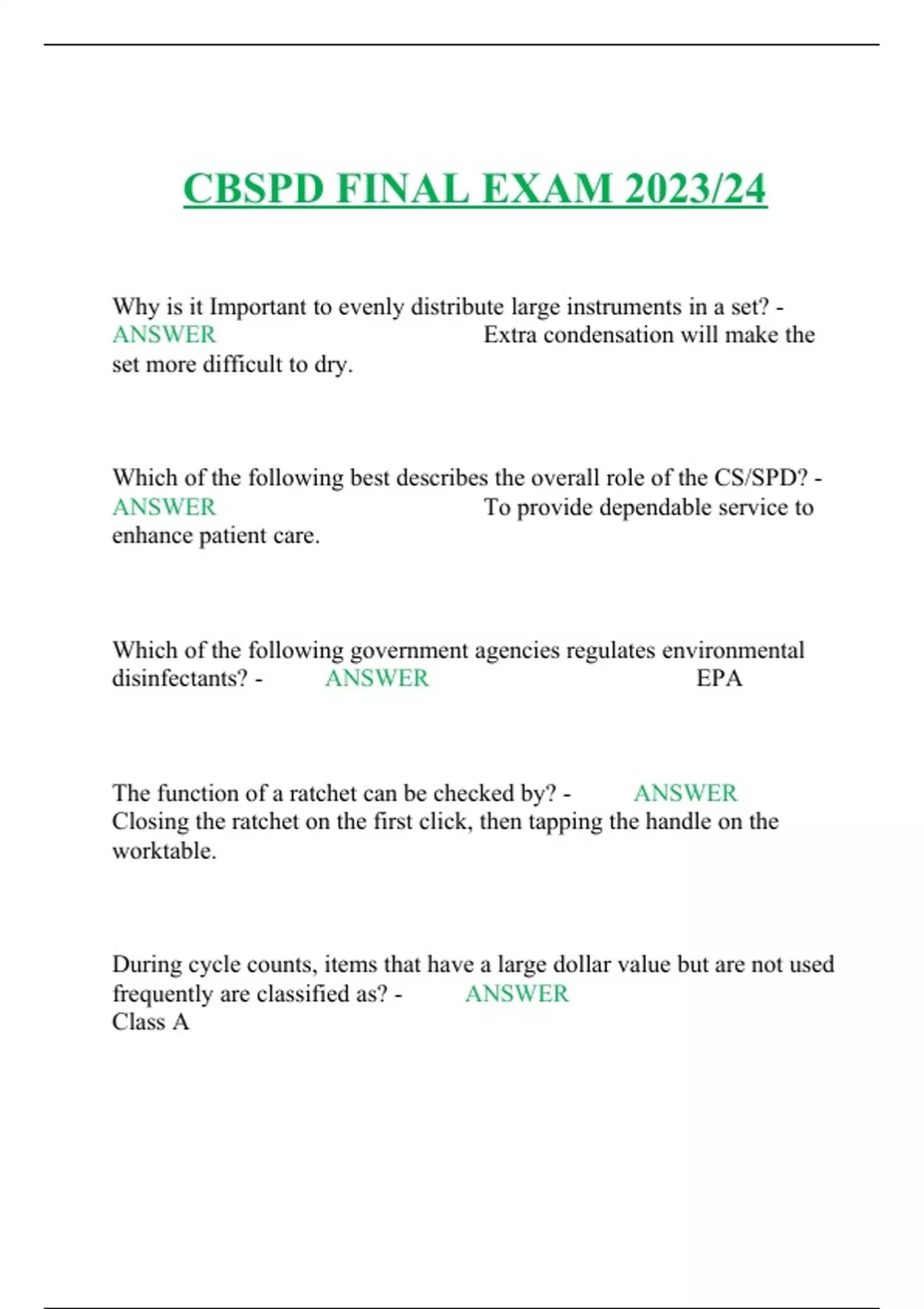 CBSPD FINAL EXAM 2023/24 Why is it Important to evenly distribute large instruments in a set? - ANSWER Extra condensation will make the set more difficult to dry. Which of the following best describes the overall role of the CS/SPD? - ANSWER To provide dependable service to enhance patient care. Which of the following government agencies regulates environmental disinfectants? - ANSWER EPA The function of a ratchet can be checked by? - ANSWER Closing the ratchet on the first click, then tapping the handle on the worktable. During cycle counts, items that have a large dollar value but are not used frequently are classified as? - ANSWER Class A