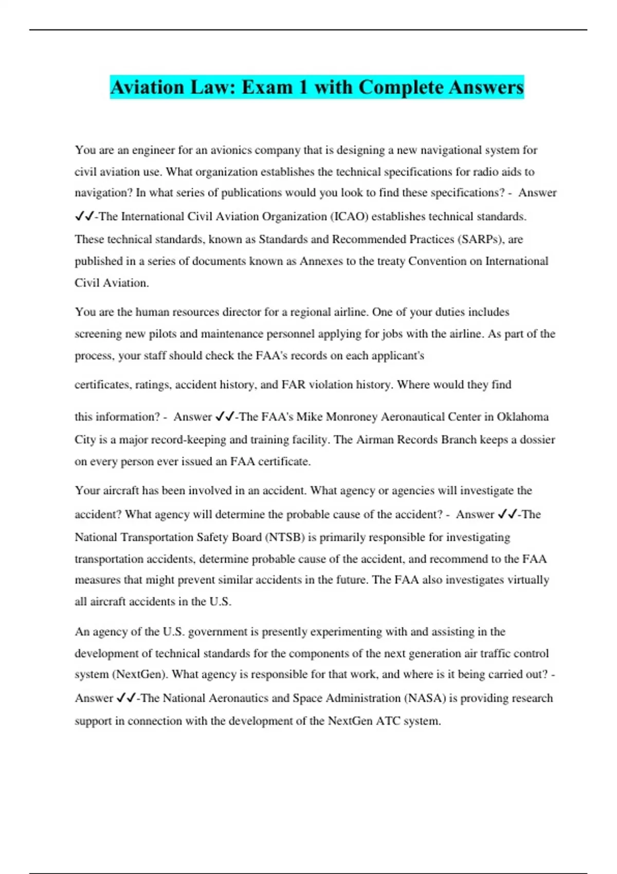 You are an engineer for an avionics company that is designing a new navigational system for civil aviation use. What organization establishes the technical specifications for radio aids to navigation? In what series of publications would you look to find these specifications? - Answer ️️ -The International Civil Aviation Organization (ICAO) establishes technical standards. These technical standards, known as Standards and Recommended Practices (SARPs), are published in a series of documents known as Annexes to the treaty Convention on International Civil Aviation. You are the human resources director for a regional airline. One of your duties includes screening new pilots and maintenance personnel applying for jobs with the airline. As part of the process, your staff should check the FAA's records on each applicant's certificates, ratings, accident history, and FAR violation history. Where would they find this information? - Answer ️️ -The FAA's Mike Monroney Aeronautical Center in Oklahoma City is a major record-keeping and training facility. The Airman Records Branch keeps a dossier on every person ever issued an FAA certificate. Your aircraft has been involved in an accident. What agency or agencies will investigate the accident? What agency will determine the probable cause of the accident? - Answer ️️ -The National Transportation Safety Board (NTSB) is primarily responsible for investigating transportation accidents, determine probable cause of the accident, and recommend to the FAA measures that might prevent similar accidents in the future. The FAA also investigates virtually all aircraft accidents in the U.S.