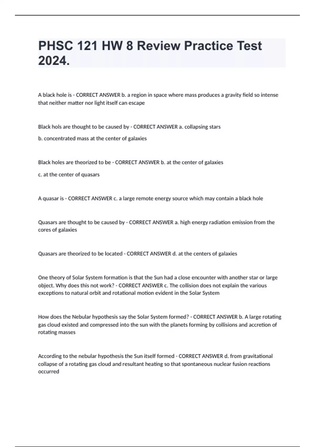 PHSC 121 HW 8 Review Practice Test 2024. A black hole is - CORRECT ANSWER b. a region in space where mass produces a gravity field so intense that neither matter nor light itself can escape Black hols are thought to be caused by - CORRECT ANSWER a. collapsing stars b. concentrated mass at the center of galaxies Black holes are theorized to be - CORRECT ANSWER b. at the center of galaxies c. at the center of quasars A quasar is - CORRECT ANSWER c. a large remote energy source which may contain a black hole Quasars are thought to be caused by - CORRECT ANSWER a. high energy radiation emission from the cores of galaxies Quasars are theorized to be located - CORRECT ANSWER d. at the centers of galaxies One theory of Solar System formation is that the Sun had a close encounter with another star or large object. Why does this not work? - CORRECT ANSWER c. The collision does not explain the various exceptions to natural orbit and rotational motion evident in the Solar System How does the Nebular hypothesis say the Solar System formed? - CORRECT ANSWER b. A large rotating gas cloud existed and compressed into the sun with the planets forming by collisions and accretion of rotating masses According to the nebular hypothesis the Sun itself formed - CORRECT ANSWER d. from gravitational collapse of a rotating gas cloud and resultant heating so that spontaneous nuclear fusion reactions occurred