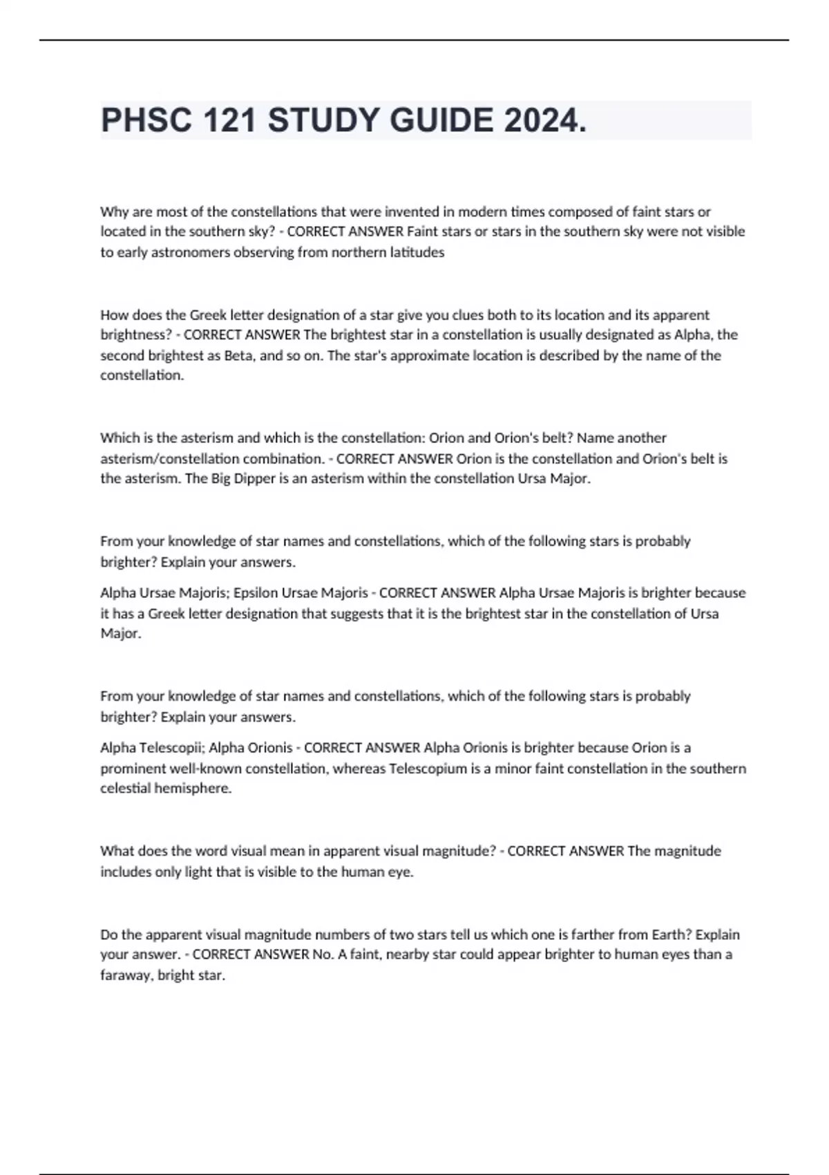 PHSC 121 STUDY GUIDE 2024. Why are most of the constellations that were invented in modern times composed of faint stars or located in the southern sky? - CORRECT ANSWER Faint stars or stars in the southern sky were not visible to early astronomers observing from northern latitudes How does the Greek letter designation of a star give you clues both to its location and its apparent brightness? - CORRECT ANSWER The brightest star in a constellation is usually designated as Alpha, the second brightest as Beta, and so on. The star's approximate location is described by the name of the constellation. Which is the asterism and which is the constellation: Orion and Orion's belt? Name another asterism/constellation combination. - CORRECT ANSWER Orion is the constellation and Orion's belt is the asterism. The Big Dipper is an asterism within the constellation Ursa Major. From your knowledge of star names and constellations, which of the following stars is probably brighter? Explain your answers. Alpha Ursae Majoris; Epsilon Ursae Majoris - CORRECT ANSWER Alpha Ursae Majoris is brighter because it has a Greek letter designation that suggests that it is the brightest star in the constellation of Ursa Major. From your knowledge of star names and constellations, which of the following stars is probably brighter? Explain your answers. Alpha Telescopii; Alpha Orionis - CORRECT ANSWER Alpha Orionis is brighter because Orion is a prominent well-known constellation, whereas Telescopium is a minor faint constellation in the southern celestial hemisphere. What does the word visual mean in apparent visual magnitude? - CORRECT ANSWER The magnitude includes only light that is visible to the human eye. Do the apparent visual magnitude numbers of two stars tell us which one is farther from Earth? Explain your answer. - CORRECT ANSWER No. A faint, nearby star could appear brighter to human eyes than a faraway, bright star.