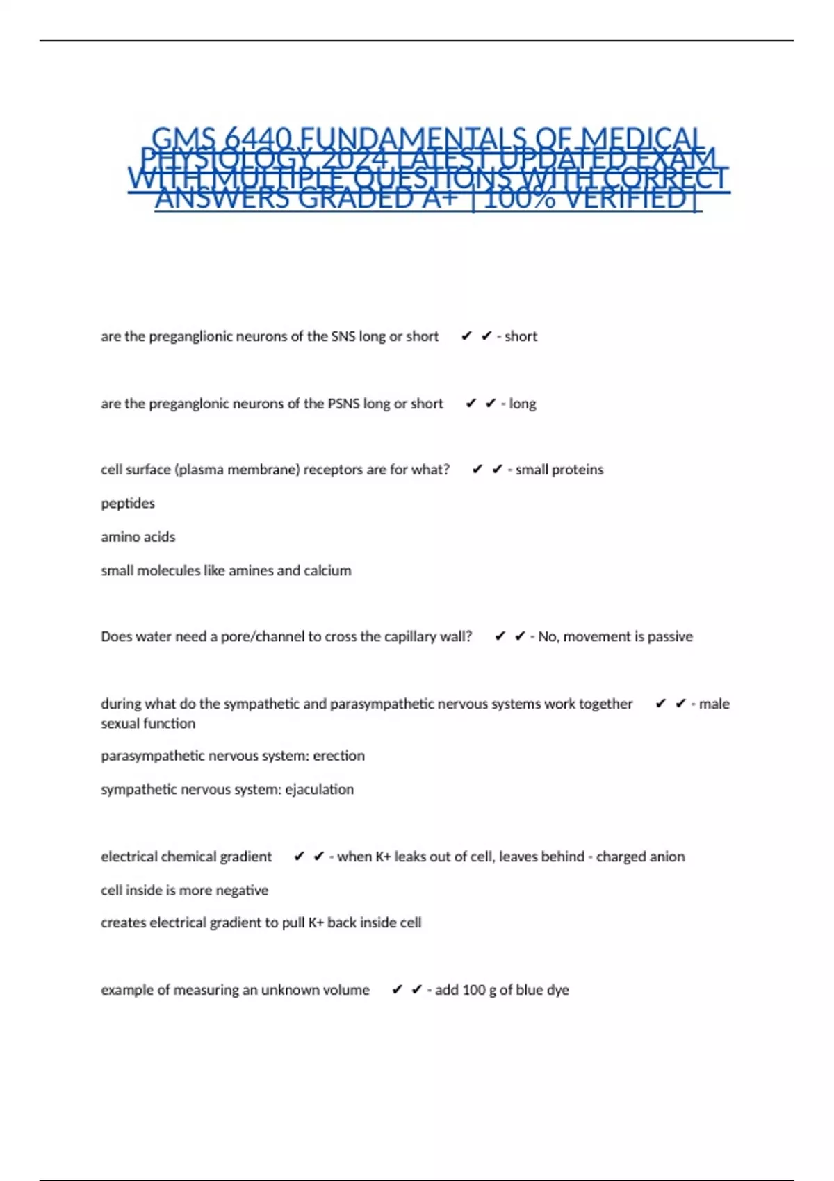GMS 6440 FUNDAMENTALS OF MEDICAL PHYSIOLOGY 2024 LATEST UPDATED EXAM WITH MULTIPLE QUESTIONS WITH CORRECT ANSWERS GRADED A+ |100% VERIFIED|