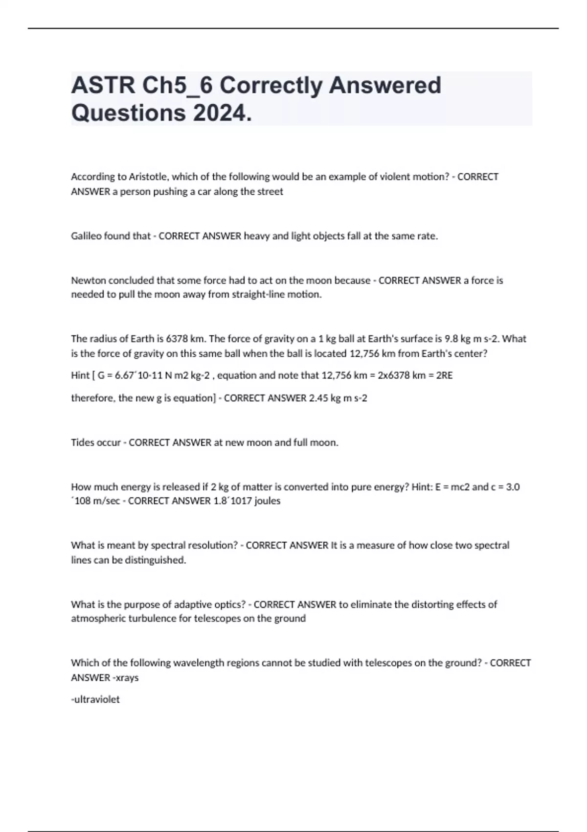 ASTR Ch5_6 Correctly Answered Questions 2024. According to Aristotle, which of the following would be an example of violent motion? - CORRECT ANSWER a person pushing a car along the street Galileo found that - CORRECT ANSWER heavy and light objects fall at the same rate. Newton concluded that some force had to act on the moon because - CORRECT ANSWER a force is needed to pull the moon away from straight-line motion. The radius of Earth is 6378 km. The force of gravity on a 1 kg ball at Earth's surface is 9.8 kg m s-2. What is the force of gravity on this same ball when the ball is located 12,756 km from Earth's center? Hint [ G = 6.67´10-11 N m2 kg-2 , equation and note that 12,756 km = 2x6378 km = 2RE therefore, the new g is equation] - CORRECT ANSWER 2.45 kg m s-2 Tides occur - CORRECT ANSWER at new moon and full moon. How much energy is released if 2 kg of matter is converted into pure energy? Hint: E = mc2 and c = 3.0´108 m/sec - CORRECT ANSWER 1.8´1017 joules What is meant by spectral resolution? - CORRECT ANSWER It is a measure of how close two spectral lines can be distinguished. What is the purpose of adaptive optics? - CORRECT ANSWER to eliminate the distorting effects of atmospheric turbulence for telescopes on the ground Which of the following wavelength regions cannot be studied with telescopes on the ground? - CORRECT ANSWER -xrays -ultraviolet
