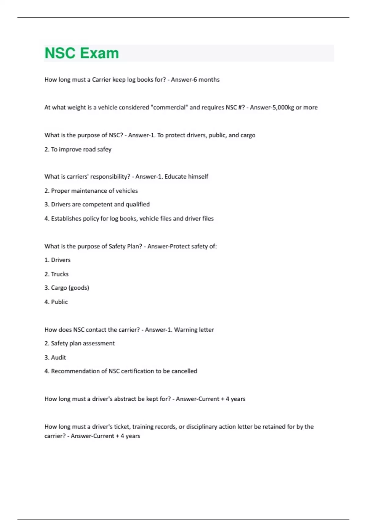 How long must a Carrier keep log books for? - Answer-6 months At what weight is a vehicle considered "commercial" and requires NSC #? - Answer-5,000kg or more What is the purpose of NSC? - Answer-1. To protect drivers, public, and cargo 2. To improve road safey What is carriers' responsibility? - Answer-1. Educate himself 2. Proper maintenance of vehicles 3. Drivers are competent and qualified 4. Establishes policy for log books, vehicle files and driver files What is the purpose of Safety Plan? - Answer-Protect safety of: 1. Drivers 2. Trucks 3. Cargo (goods) 4. Public How does NSC contact the carrier? - Answer-1. Warning letter 2. Safety plan assessment 3. Audit 4. Recommendation of NSC certification to be cancelled How long must a driver's abstract be kept for? - Answer-Current + 4 years How long must a driver's ticket, training records, or disciplinary action letter be retained for by the carrier? - Answer-Current + 4 yearsAccident reports must be kept for how long? Accident files must be retained for how long by the carrier? - Answer-Current + 4 years Howe long must supporting documents be kept for? - Answer-6 months Vehicle records such as maintenance must be kept for how long? - Answer-3 years How often should driver logs be submitted to carrier? - Answer-within 20 days How long does a carrier keep the pre-inspections? - Answer-3 months How often should a carrier request drivers abstracts? - Answer-Once on hire; then annually What is a recall system? - Answer-A reminder system to remind if important dates-license expiry, CVP expiry ect. How many hours are legal "on duty" in a day? - Answer-14 (13 max driving) How many hours off does a driver need in a day? - Answer-10 (8 must be sleep) Cycle 1 requires how many hours consecutive off for it to reset? - Answer-36 hours Cycle 2 requires how many hours off for it to reset? - Answer-72 hours To switch from cycle 2 to cycle 1, driver needs how many hours off? - Answer-72 hours How many personal kms can a driver drive in a day? - Answer-75kmHow many days of logs must drivers keep with him at all times? - Answer-Previous 14 Who is exempt from doing log books? - Answer-1. 2 or 3 axle commercial vehicle used primarily for farm, forest, sea or lake 2. emergency vehicles 3. vehicles used for relief work 4. road building machines 5. if driving personal use 6. carriers that operate in BC only, non passengers and with a licensed GVW 11, 794kg What vehicles must get CVIP done? (1) - Answer-1. Taxi/limo (carrying passengers) 2. Buses 3. Vehicles with GVW of more than 8200kg 4. Trailers/semi-truck IF a driver does a brake adjustment, must he make of a note of this on pre-trip? - Answer-YES- all defects must be noticed When picking up a DG load, who is responsible? - Answer-Carrier, driver What must a driver possess before he can drive? - Answer-1. drivers license 2. make sure insurance and CVIP's in truck 3. Previous 14 days logs 4. Current day log completed up to the current time 5. Supporting documents for the current trip If driver is working for 2 carriers, what are his log book requirements? - Answer-1. Must be submitted within a 20 day of completing the log 2. Submit to original log to the first carrier and copy to each subsequent carrier for that day 3. Original supporting documents to the applicable carrierHow would you setup a driver file? - Answer-1. Application 2. Company policy 3. Current copy of drivers license (both sides) 4. Drivers abstract-one at time of hiring then annually 5. Driver incident record (violations, training records, disciplinary letters, ect.) 6. All kept for 4 years