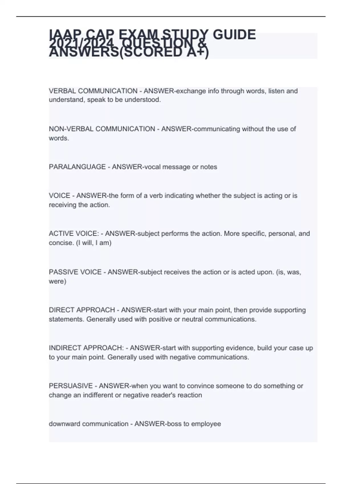 VERBAL COMMUNICATION - ANSWER-exchange info through words, listen and understand, speak to be understood. NON-VERBAL COMMUNICATION - ANSWER-communicating without the use of words. PARALANGUAGE - ANSWER-vocal message or notes VOICE - ANSWER-the form of a verb indicating whether the subject is acting or is receiving the action. ACTIVE VOICE: - ANSWER-subject performs the action. More specific, personal, and concise. (I will, I am) PASSIVE VOICE - ANSWER-subject receives the action or is acted upon. (is, was, were) DIRECT APPROACH - ANSWER-start with your main point, then provide supporting statements. Generally used with positive or neutral communications. INDIRECT APPROACH: - ANSWER-start with supporting evidence, build your case up to your main point. Generally used with negative communications. PERSUASIVE - ANSWER-when you want to convince someone to do something or change an indifferent or negative reader's reaction downward communication - ANSWER-boss to employee upward communication - ANSWER-employee to boss horizontal communication - ANSWER-coworker to coworker; manager to manager; within team diagonal communication - ANSWER-employee to co-worker's manager INFORMAL COMMUNICATION - ANSWER-unofficial (grapevine). May or may not be true (though a surprisingly high percentage is found to be true). CUSTOMER RELATIONSHIP MANAGEMENT (CRM) - ANSWER-use of technology to organize, automate, and track customer purchases, inquiries, needs, interests. CUSTOMER SERVICE - ANSWER-the ability of an organization to consistently give customers what they want and need. CUSTOMER FOCUS - ANSWER-the attitude and commitment of providing great customer service.