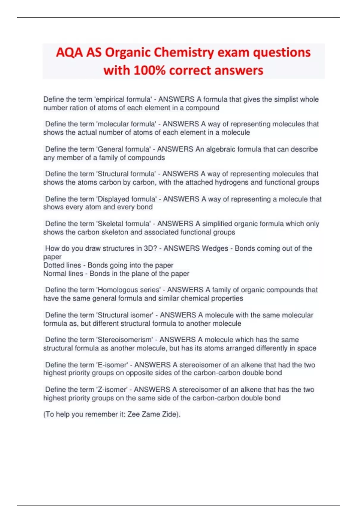 AQA AS Organic Chemistry exam questions with 100% correct answers Define the term 'empirical formula' - ANSWERS A formula that gives the simplist whole number ration of atoms of each element in a compound Define the term 'molecular formula' - ANSWERS A way of representing molecules that shows the actual number of atoms of each element in a molecule Define the term 'General formula' - ANSWERS An algebraic formula that can describe any member of a family of compounds Define the term 'Structural formula' - ANSWERS A way of representing molecules that shows the atoms carbon by carbon, with the attached hydrogens and functional groups Define the term 'Displayed formula' - ANSWERS A way of representing a molecule that shows every atom and every bond Define the term 'Skeletal formula' - ANSWERS A simplified organic formula which only shows the carbon skeleton and associated functional groups How do you draw structures in 3D? - ANSWERS Wedges - Bonds coming out of the paper Dotted lines - Bonds going into the paper Normal lines - Bonds in the plane of the paper Define the term 'Homologous series' - ANSWERS A family of organic compounds that have the same general formula and similar chemical properties Define the term 'Structural isomer' - ANSWERS A molecule with the same molecular formula as, but different structural formula to another molecule Define the term 'Stereoisomerism' - ANSWERS A molecule which has the same structural formula as another molecule, but has its atoms arranged differently in space Define the term 'E-isomer' - ANSWERS A stereoisomer of an alkene that had the two highest priority groups on opposite sides of the carbon-carbon double bond Define the term 'Z-isomer' - ANSWERS A stereoisomer of an alkene that has the two highest priority groups on the same side of the carbon-carbon double bond (To help you remember it: Zee Zame Zide). Define the term 'E/Z isomerism' - ANSWERS A type of stereoisomerism that is cause ld by the restricted rotation about a carbon-carbon double bond, each of he carbon atoms must have two different groups attached Define the term 'Alkanes' - ANSWERS A saturated hydrocarbon with the general formula CnH2n+2 Define the term 'Petroleum' - ANSWERS A mixture consisting mainly of alkane hydrocarbons that can be separated into different fractions Define the term 'Cracking' - ANSWERS Long chain hydrocarbons are broken down into shorter chain hydrocarbons. This produces a mixture of alkanes and alkenes Describe thermal cracking. Include conditions in your answer. - ANSWERS Temperatures between 700k and 1200k Pressure of up to 7000 KPa. 1) Carbon-carbon breaks to produce two free radicals. 2) Free radicals are highly reactive and react to produce many alkenes and some alkanes. Why are long chain hydrocarbons not kept under high temperatures for long amounts of time? - ANSWERS At higher temperatures, these chains decompose. Given enough time, this will eventually result in products which are only hydrogen gas and solid carbon. Describe catalytic cracking. Include conditions in your answer. - ANSWERS Zeolite catalyst. 720K. Low pressure. Hydrocarbons are mixed with a catalyst which has been ground into a fine powder. Produces lots of branched alkanes and aromatic hydrocarbons Describe a zeolite catalyst - ANSWERS A substance which has a honeycomb structure with an enormous surface area. They are usually acidic. What type of products are usually formed from catalytic cracking? - ANSWERS Branched alkanes Cycloalkanes (rings) Aromatic compounds (e.g. benzene) Define the term 'Halogenoalkanes' - ANSWERS An alkane with at least one halogen atom in place of a hydrogen atom Define the term 'Ozone layer' - ANSWERS A layer of ozone (O3) found in the earth's upper atmosphere which protects the earth from ultra violet radiation Define the term 'Alkenes' - ANSWERS An unsaturated hydrocarbon with the general formula CnH2n, containing at least one carbon-carbon double bond How can we test for the presence of a C=C double bond? - ANSWERS Add bromine water (an orange solution) to the unknown solution. If a C=C double bond is present then the solution will decolourise (turn colourless). What conditions are needed for an alcohol to be made from an alkene? - ANSWERS Steam High temperature