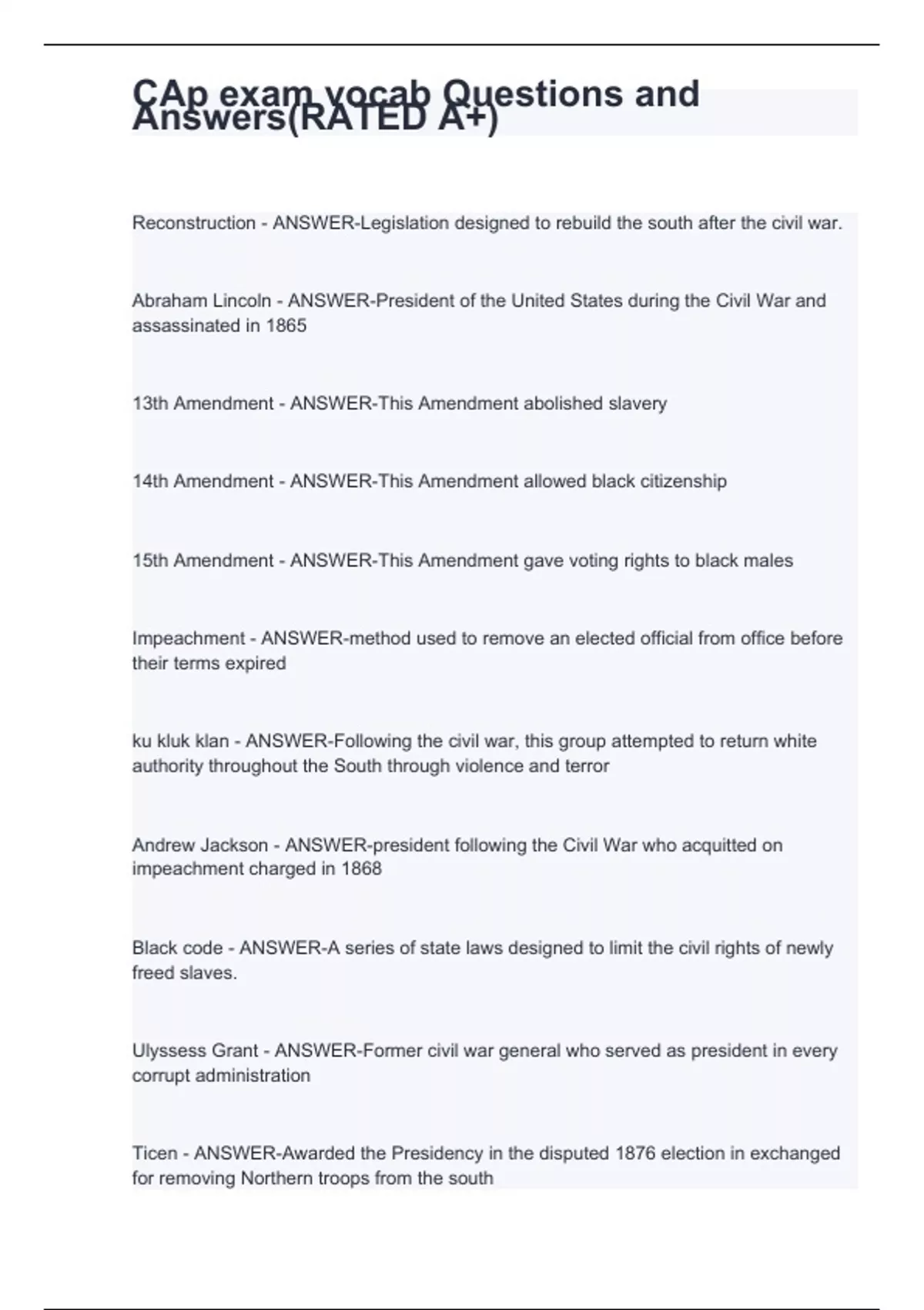 Abraham Lincoln - ANSWER-President of the United States during the Civil War and assassinated in 1865 13th Amendment - ANSWER-This Amendment abolished slavery 14th Amendment - ANSWER-This Amendment allowed black citizenship 15th Amendment - ANSWER-This Amendment gave voting rights to black males Impeachment - ANSWER-method used to remove an elected official from office before their terms expired ku kluk klan - ANSWER-Following the civil war, this group attempted to return white authority throughout the South through violence and terror Andrew Jackson - ANSWER-president following the Civil War who acquitted on impeachment charged in 1868 Black code - ANSWER-A series of state laws designed to limit the civil rights of newly freed slaves. Ulyssess Grant - ANSWER-Former civil war general who served as president in every corrupt administration