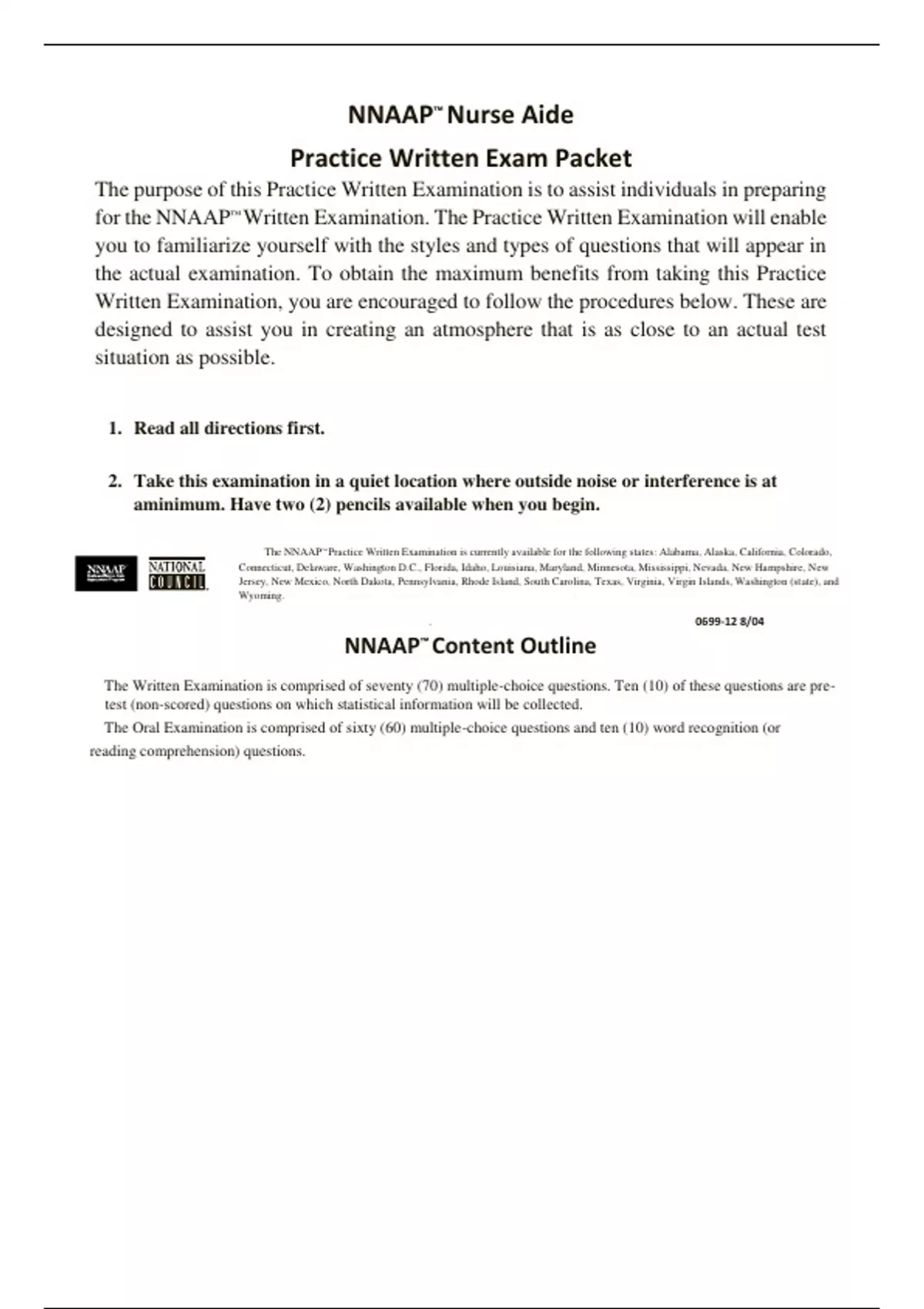 The purpose of this Practice Written Examination is to assist individuals in preparing for the NNAAP™ Written Examination. The Practice Written Examination will enable you to familiarize yourself with the styles and types of questions that will appear in the actual examination. To obtain the maximum benefits from taking this Practice Written Examination, you are encouraged to follow the procedures below. These are designed to assist you in creating an atmosphere that is as close to an actual test situation as possible.