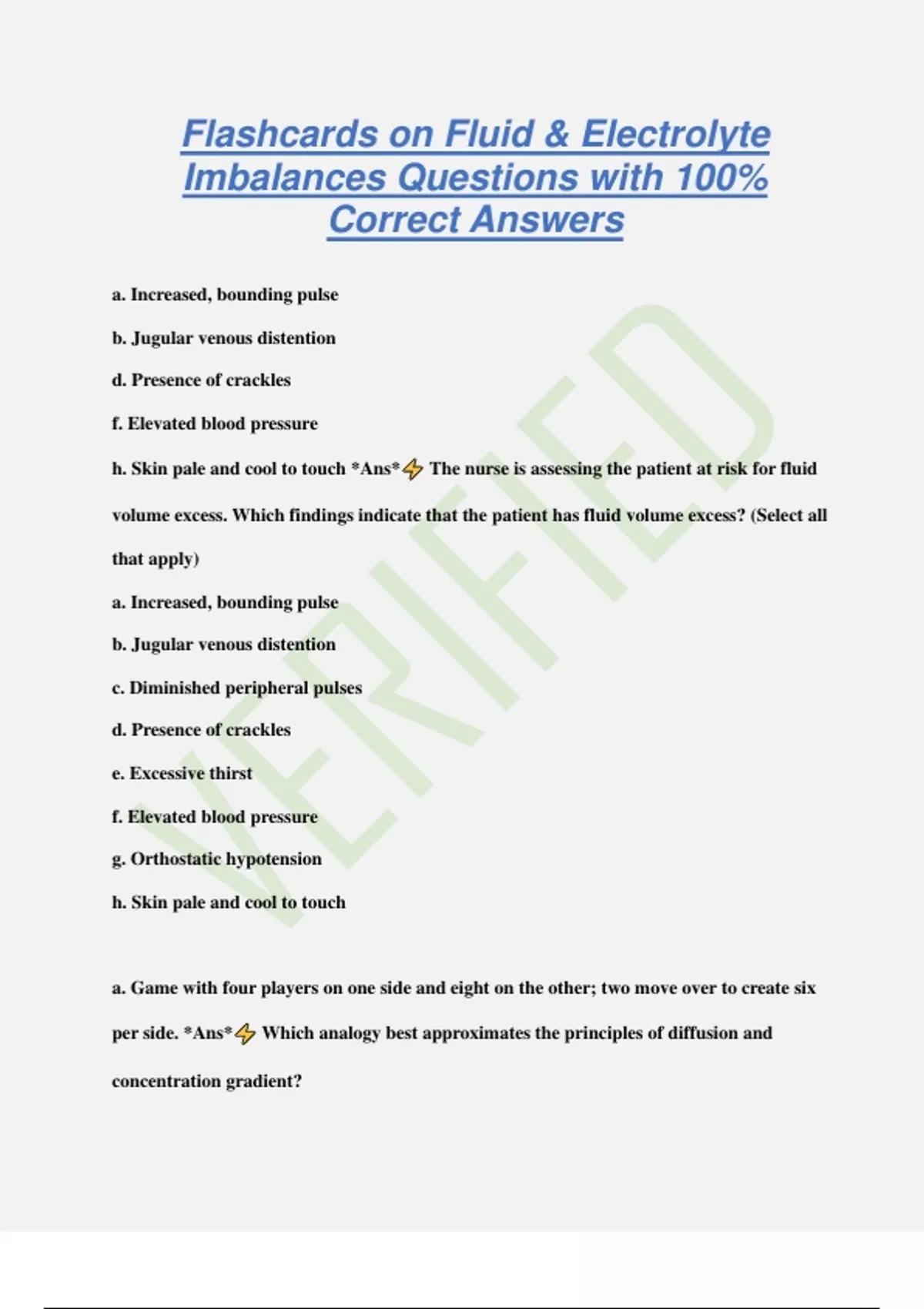 Flashcards on Fluid & Electrolyte Imbalances Questions with 100% Correct Answers a. Increased, bounding pulse b. Jugular venous distention d. Presence of crackles f. Elevated blood pressure h. Skin pale and cool to touch *Ans* The nurse is assessing the patient at risk for fluid volume excess. Which findings indicate that the patient has fluid volume excess? (Select all that apply) a. Increased, bounding pulse b. Jugular venous distention c. Diminished peripheral pulses d. Presence of crackles e. Excessive thirst f. Elevated blood pressure g. Orthostatic hypotension h. Skin pale and cool to touch a. Game with four players on one side and eight on the other; two move over to create six per side. *Ans* Which analogy best approximates the principles of diffusion and concentration gradient? a. Game with four players on one side and eight on the other; two move over to create six per side b. Community fun run where 2000 participants move across the line in a mass start. c. Basketball game of five players per side; all players move across the court. d. Concert where 1000 people are trying to enter through a single gate. b. Thirst *Ans* The patient's blood osmolality is 302 mOsm/L. What manifestation does the nurse expect to see in the patient? a. Increased urine output b. Thirst c. Peripheral edema d. Nausea d. Weigh self each day on the same scale. *Ans* The patient is at risk for fluid volume excess. For self-management at home, what does the nurse teach the patient to do? a. Increase diuretic dose if swelling occurs. b. Limit the amount of free water in relation to sodium intake. c. Monitor his or her skin turgor. d. Weigh self each day on the same scale. b. Mental status change *Ans* The older adult patient at risk for fluid and electrolyte problems is vigilantly monitored by the nurse for the first indication of a fluid balance