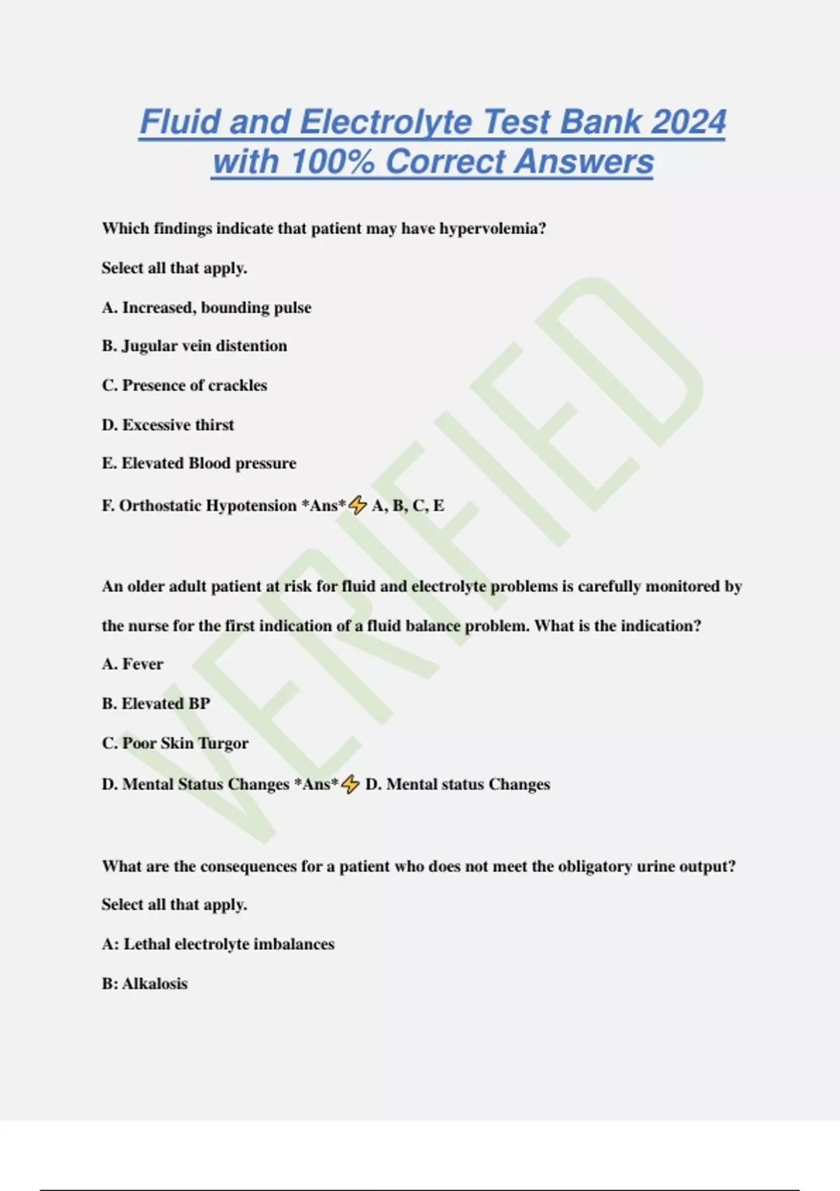 Fluid and Electrolyte Test Bank 2024 with 100% Correct Answers Which findings indicate that patient may have hypervolemia? Select all that apply. A. Increased, bounding pulse B. Jugular vein distention C. Presence of crackles D. Excessive thirst E. Elevated Blood pressure F. Orthostatic Hypotension *Ans* A, B, C, E An older adult patient at risk for fluid and electrolyte problems is carefully monitored by the nurse for the first indication of a fluid balance problem. What is the indication? A. Fever B. Elevated BP C. Poor Skin Turgor D. Mental Status Changes *Ans* D. Mental status Changes What are the consequences for a patient who does not meet the obligatory urine output? Select all that apply. A: Lethal electrolyte imbalances B: Alkalosis C: Urine becomes diluted D: Toxic build up of nitrogen E: Urine out put decreases F: Acidosis *Ans* A, D, F Which patient is at risk for excess insensible water loss? A. Patient with constant GI suctioning B: Patient with slow, deep respirations C. Patient receiving O2 therapy D. Patient with hypothermia *Ans* A. Gastric Suctioning Patients with which conditions are at greatest risk for deficient fluid volume? Select all that apply. A. Fever of 103 B. Extensive burns C. Thyroid Crisis D. Water intoxication E. Continuous fistula drainage F. Diabetes Insipidus *Ans* A, B, C, E, F The nurse is working in a long term care facility where there are numerous