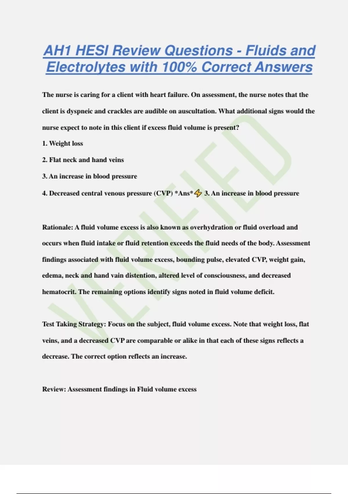 AH1 HESI Review Questions - Fluids and Electrolytes with 100% Correct Answers The nurse is caring for a client with heart failure. On assessment, the nurse notes that the client is dyspneic and crackles are audible on auscultation. What additional signs would the nurse expect to note in this client if excess fluid volume is present? 1. Weight loss 2. Flat neck and hand veins 3. An increase in blood pressure 4. Decreased central venous pressure (CVP) *Ans* 3. An increase in blood pressure Rationale: A fluid volume excess is also known as overhydration or fluid overload and occurs when fluid intake or fluid retention exceeds the fluid needs of the body. Assessment findings associated with fluid volume excess, bounding pulse, elevated CVP, weight gain, edema, neck and hand vain distention, altered level of consciousness, and decreased hematocrit. The remaining options identify signs noted in fluid volume deficit. Test Taking Strategy: Focus on the subject, fluid volume excess. Note that weight loss, flat veins, and a decreased CVP are comparable or alike in that each of these signs reflects a decrease. The correct option reflects an increase. Review: Assessment findings in Fluid volume excess The nurse if preparing to care of a client with a potassium deficit. The nurse reviews the client's record and determines that the client was at risk for developing the potassium deficit because of which situation? 1. Sustained tissue damage 2. Requires nasogastric suction 3. Has a history of Addison's disease 4. Is taking a potassium retaining diuretic *Ans* 2. Requires nasogastric suction Rationale: The normal serum potassium level is 3.5 mEq/L to 5.0 mEq/L. A potassium deficit is known as hypokalemia. Potassium rich gastrointestinal fluids are lost through gastrointestinal suction, placing the client at risk for hypokalemia. The client with tissue damage or Addison's disease and the client taking a potassium retaining diuretic are at risk for hyperkalemia. Test taking strategy: Note that the subject of the questions is potassium deficit. The correct option is the only one that identifies a loss of body fluid.