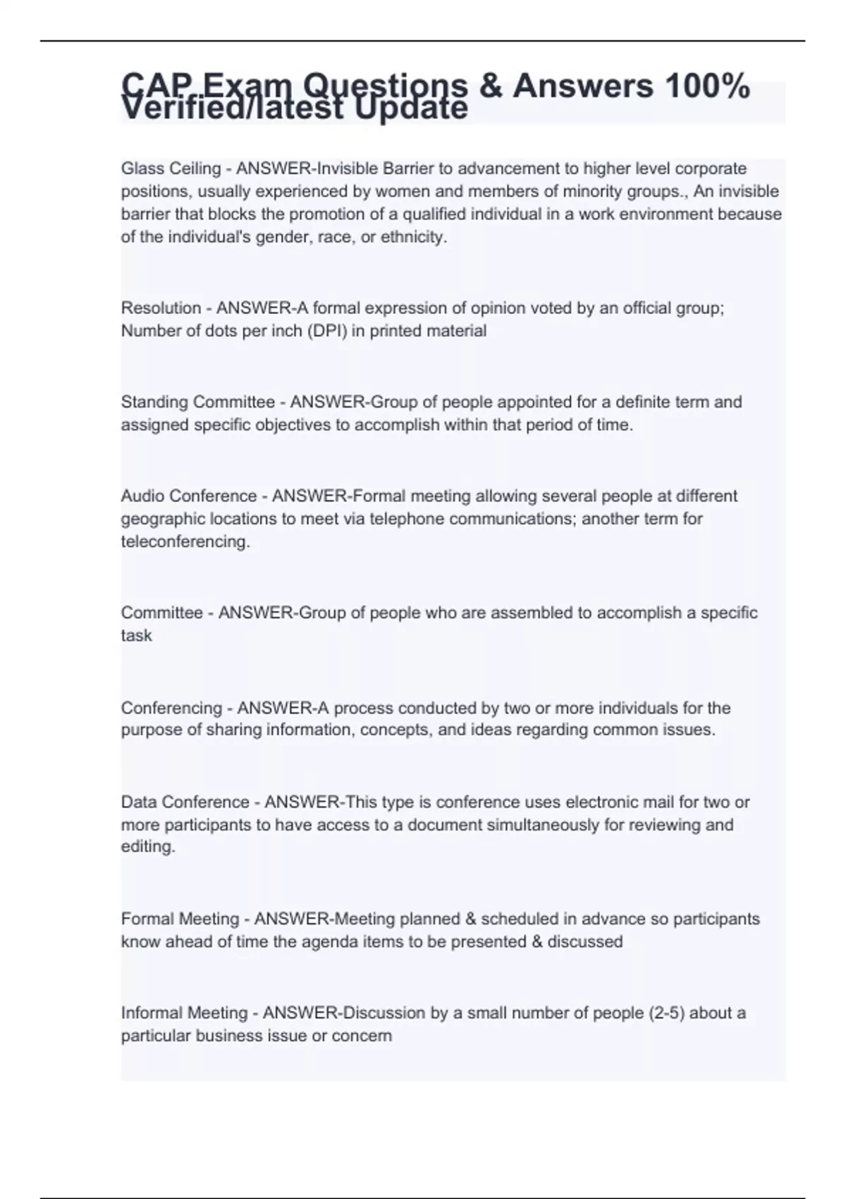 Resolution - ANSWER-A formal expression of opinion voted by an official group; Number of dots per inch (DPI) in printed material Standing Committee - ANSWER-Group of people appointed for a definite term and assigned specific objectives to accomplish within that period of time. Audio Conference - ANSWER-Formal meeting allowing several people at different geographic locations to meet via telephone communications; another term for teleconferencing. Committee - ANSWER-Group of people who are assembled to accomplish a specific task Conferencing - ANSWER-A process conducted by two or more individuals for the purpose of sharing information, concepts, and ideas regarding common issues. Data Conference - ANSWER-This type is conference uses electronic mail for two or more participants to have access to a document simultaneously for reviewing and editing. Formal Meeting - ANSWER-Meeting planned & scheduled in advance so participants know ahead of time the agenda items to be presented & discussed Informal Meeting - ANSWER-Discussion by a small number of people (2-5) about a particular business issue or concern