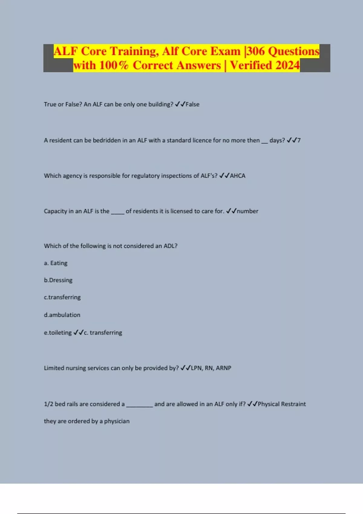 ALF Core Training, Alf Core Exam |306 Questions with 100% Correct Answers | Verified 2024