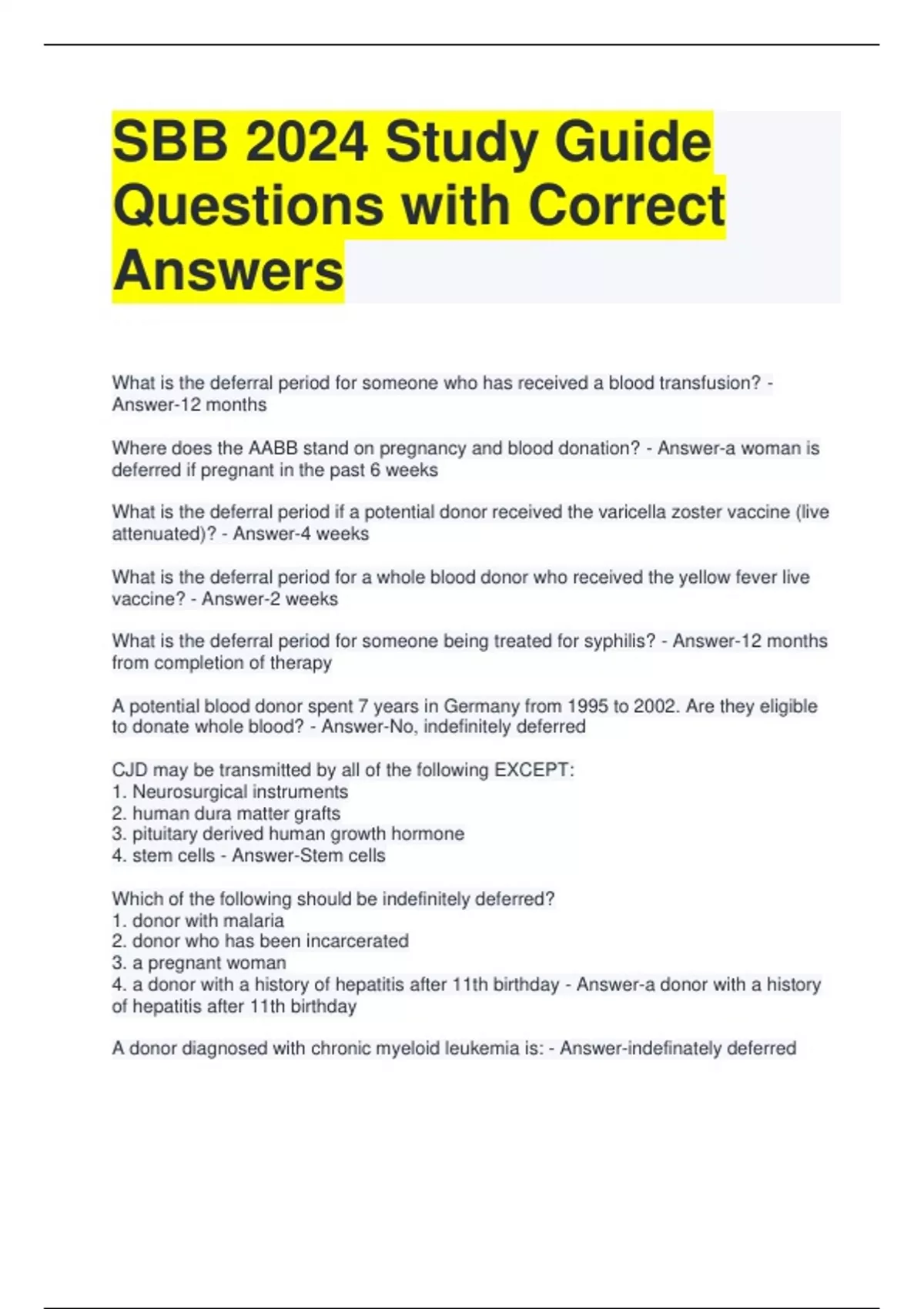SBB 2024 Study Guide Questions with Correct Answers What is the deferral period for someone who has received a blood transfusion? - Answer-12 months Where does the AABB stand on pregnancy and blood donation? - Answer-a woman is deferred if pregnant in the past 6 weeks What is the deferral period if a potential donor received the varicella zoster vaccine (live attenuated)? - Answer-4 weeks What is the deferral period for a whole blood donor who received the yellow fever live vaccine? - Answer-2 weeks What is the deferral period for someone being treated for syphilis? - Answer-12 months from completion of therapy A potential blood donor spent 7 years in Germany from 1995 to 2002. Are they eligible to donate whole blood? - Answer-No, indefinitely deferred CJD may be transmitted by all of the following EXCEPT: 1. Neurosurgical instruments 2. human dura matter grafts 3. pituitary derived human growth hormone 4. stem cells - Answer-Stem cells Which of the following should be indefinitely deferred? 1. donor with malaria 2. donor who has been incarcerated 3. a pregnant woman 4. a donor with a history of hepatitis after 11th birthday - Answer-a donor with a history of hepatitis after 11th birthday A donor diagnosed with chronic myeloid leukemia is: - Answer-indefinately deferred A potential whole blood donor presents with the following upon physical exam: Hgb 13 g/dL, Hct 39%, pulse 75, temp 99.4, can they donate a unit of allogeneic whole blood? - Answer-Yes A donor who ingests aspirin is deferred for 48 hours because aspirin interferes with? - Answer-Platelet aggregation A donor who has had a positive test for AIDS/HIV virus is: - Answer-indefinitely deferred What is the interval between allogeneic blood donations? - Answer-56 days What is the deferral period for an apheresis donor who wishes to donate whole blood? - Answer-48 hours In this type of autologous donation, blood is collected just before the start of surgery so that blood shed during surgery has a lower concentration of red cells? - Answer- normovolemic hemodilution In double red cell pheresis, the interval between donation is: - Answer-16 weeks A potential allogeneic whole blood donor was incarcerated for 5 years. He was granted parole and wished to contribute to his community by donating blood. Can he donate? - Answer-Yes, but there is a 12 mo. deferral period from the date he left prison What special considerations should be givien to directed donations? - Answer-Blood must be irradiated if from a blood relative A minipool of 16 donor samples was analyzed for HCV RNA. The test was positive. Which of the following courses of action would be followed? - Answer-Test each of the pools individually or test a smaller pool Last week, a school teacher donated an allogeneic unit of whole blood. Upon testing for HIV antibodies by EIA, one test was reactive and a repeat test was nonreactive. What should be done with the unit that was donated? - Answer-Discard the unit and quarantine any in date units What purpose does irradiation serve? - Answer-Destroys T lymphocytes An 18 yr. old girl contracted Babesia after a two week camping trip in NE Pennsylvania. A blood drive was scheduled at her school 6 mo. later. Should she donate blood? - Answer-No, indefinite deferral What is the deferral period for donating allogeneic whole blood after an accidental needle stick? - Answer-12 months A Peace Corp worker spent 2 yrs. in Nigeria. After having been there for only 3 mo, he was diagnosed with malaria. When may this worker be eligible for blood donation? - Answer-3 yrs. after becoming asymptomatic A male donor comes to donate whole blood, when he shows the tech his arm, the tech notices track marks. What action should be taken? - Answer-Document a indefinite deferral in the donor record What is the deferral period for receiving the recombinant HPV vaccine? - Answer-None What is the deferral period for a patient on Plavix? - Answer-14 days after last dose A phlebotomist received Hepatitis B Immune globulin after receiving prophylactic therapy for an accidental needle stick. Is there a deferral period? - Answer-12 months Is it possible to donate a unit of blood in the US at age 16? - Answer-Yes A pheresis donor donated plasma one day ago. When can this donor give a unit of whole blood? - Answer-In 24 hours