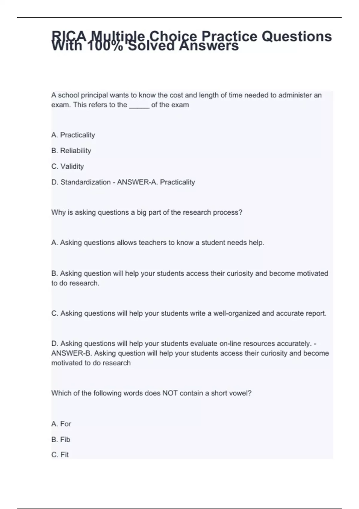 A school principal wants to know the cost and length of time needed to administer an exam. This refers to the _____ of the exam A. Practicality B. Reliability C. Validity D. Standardization - ANSWER-A. Practicality Why is asking questions a big part of the research process? A. Asking questions allows teachers to know a student needs help. B. Asking question will help your students access their curiosity and become motivated to do research. C. Asking questions will help your students write a well-organized and accurate report. D. Asking questions will help your students evaluate on-line resources accurately. - ANSWER-B. Asking question will help your students access their curiosity and become motivated to do research Which of the following words does NOT contain a short vowel? A. For B. Fib C. Fit D Film - ANSWER-A. For The book Mosaic of Thought explains what type of instructional strategies for reading?