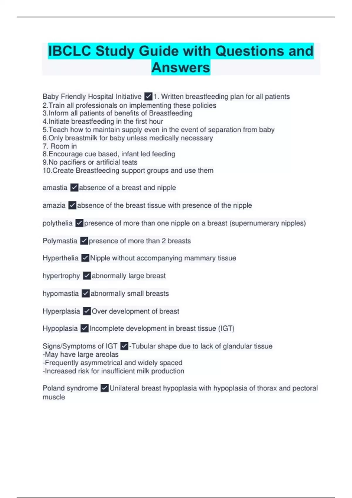 IBCLC Study Guide with Questions and Answers