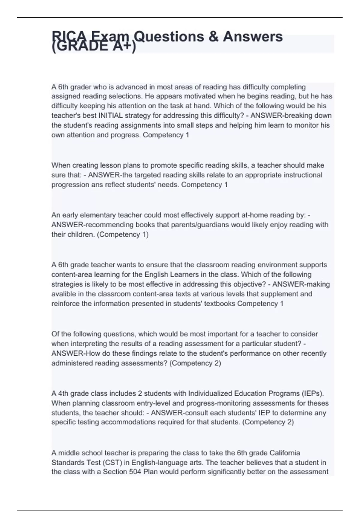 RICA Exam Questions & Answers (GRADE A+)
