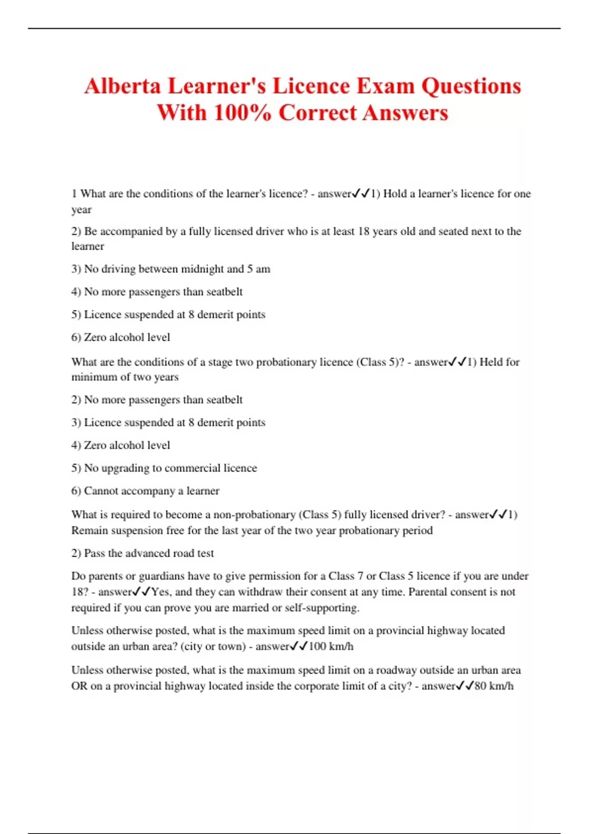 Alberta Learner's Licence Exam Questions With 100% Correct Answers 1 What are the conditions of the learner's licence? - answer1) Hold a learner's licence for one year 2) Be accompanied by a fully licensed driver who is at least 18 years old and seated next to the learner 3) No driving between midnight and 5 am 4) No more passengers than seatbelt 5) Licence suspended at 8 demerit points 6) Zero alcohol level What are the conditions of a stage two probationary licence (Class 5)? - answer1) Held for minimum of two years 2) No more passengers than seatbelt 3) Licence suspended at 8 demerit points 4) Zero alcohol level 5) No upgrading to commercial licence 6) Cannot accompany a learner What is required to become a non-probationary (Class 5) fully licensed driver? - answer1) Remain suspension free for the last year of the two year probationary period 2) Pass the advanced road test Do parents or guardians have to give permission for a Class 7 or Class 5 licence if you are under 18? - answerYes, and they can withdraw their consent at any time. Parental consent is not required if you can prove you are married or self-supporting. Unless otherwise posted, what is the maximum speed limit on a provincial highway located outside an urban area? (city or town) - answer100 km/h Unless otherwise posted, what is the maximum speed limit on a roadway outside an urban area OR on a provincial highway located inside the corporate limit of a city? - answer80 km/h Unless otherwise posted, what is the maximum speed limit on a roadway that is located within an urban area? - answer50 km/h How fast are vehicles traveling when they have a sign indicating slow moving vehicles? - answerLess than 40 km/h During what hours are school zone speed limits in effect? - answerSchool days from: 8am-9:30am 11:30am-1:30pm 3pm-4:30pm You must not exceed the posted speed limit during these times. What are the rules for playground zones? - answerMaximum 30 km/h from 8:30am to one hour after sunset. You may not pass a car going the same direction during these times. Are you allowed to turn right on a red light? - answerYes (unless a sign prohibits the turn), but only after coming to a complete stop and yielding to other traffic. Can you turn left on a red light when turning from a one-way onto a one-way - answerYes (unless otherwise directed), but only after coming to a full stop and yielding to other traffic. What is an indication that a light is about to turn from green to yellow? - answerThe presence of a pedestrian signal light chasing from "walk" to "don't walk." What does a steady green arrow mean? - answerProceed only in the direction indicated by the arrow. What does a flashing red light mean? - answerStop completely and then proceed when safe to do so. Treat like a stop sign. What does a flashing yellow light mean? - answerProceed with caution after yielding to pedestrians and other vehicles within the intersection. What does a flashing green light mean? - answerDrivers are allowed to go through without stopping unless required to yield to oncoming traffic when turning left, or to pedestrians in the crosswalk when turning right or left. What does an X mean when it is over a driving lane? - answerThe lane will be used by oncoming traffic so you must not enter or remain in the lane. What does a yellow line mean? - answerIt separates traffic traveling in opposite directions. What does a white line mean? - answerIt separates traffic traveling in the same direction.