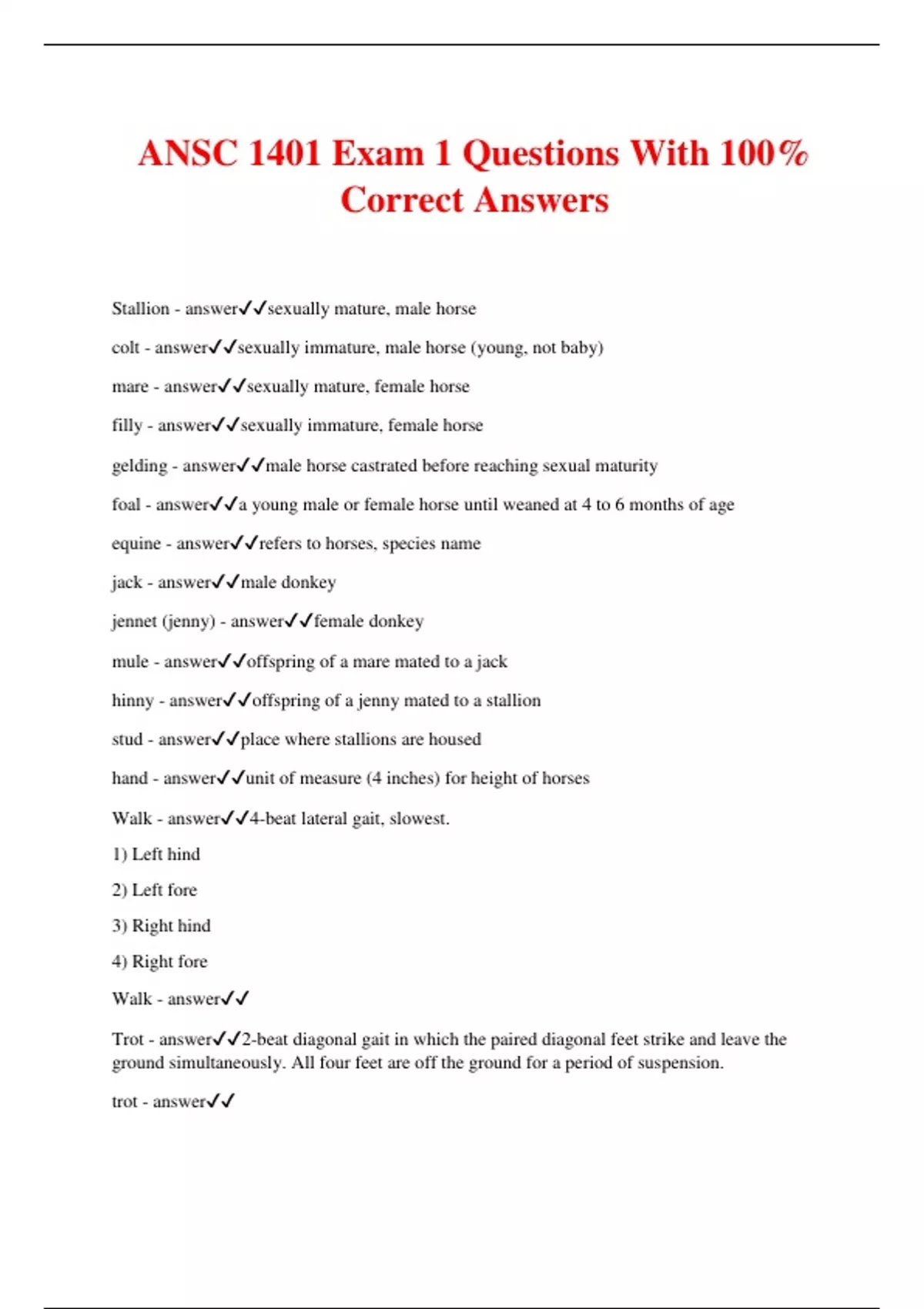 ANSC 1401 Exam 1 Questions With 100% Correct Answers Stallion - answersexually mature, male horse colt - answersexually immature, male horse (young, not baby) mare - answersexually mature, female horse filly - answersexually immature, female horse gelding - answermale horse castrated before reaching sexual maturity foal - answera young male or female horse until weaned at 4 to 6 months of age equine - answerrefers to horses, species name jack - answermale donkey jennet (jenny) - answerfemale donkey mule - answeroffspring of a mare mated to a jack hinny - answeroffspring of a jenny mated to a stallion stud - answerplace where stallions are housed hand - answerunit of measure (4 inches) for height of horses Walk - answer4-beat lateral gait, slowest. 1) Left hind 2) Left fore 3) Right hind 4) Right fore Walk - answer Trot - answer2-beat diagonal gait in which the paired diagonal feet strike and leave the ground simultaneously. All four feet are off the ground for a period of suspension. trot - answer Pace - answer2-beat lateral gait in which the lateral limbs strike the ground simultaneously. All feet are off the ground simultaneously for a period of suspension. pace - answer Canter (lope, gallop) - answer3-beat gait in which the first and third beats are made by two legs striking the ground independently and two other legs strike the ground simultaneously. Running walk - answerfast walk of the tennessee walking horse. 4 beat gait that is faster than the ordinary walk. Rack - answer4 beat gait that is executed faster than the walk or running walk. American Quarter Horse - answerAlways a solid color with white never extending above the knees. American Quarter Horse - answerUsed for recreation, work, racing, showing, rodeo, hunter/jumper. Most versatile. Fastest in the quarter mile. Arabian - answerDished faced. Long and arched neck. High tail setting. Can be bay, chestnut, brown, gray or black in color. Arabian - answerUsed for speed & stamina. Recreation, showing, some racing, endurance and competitive trail rides, stock horse. Thoroughbred - answerShort, small, refined head with a straight profile. Thoroughbred - answerKnown for their speed. Used for racing, hunters, jumpers, dressage, polo. three-day events. Morgan - answerSimilar to Arabian but not as heavily muscled, not as refined, and the neck is more upright. Morgan - answerThoroughbred x Arabian. Used for recreation and showing. Two types- English Pleasure and Stock. Standardbred - answerSmaller than the Thoroughbred Standardbred - answerUsed for sulky racing- trotters and pacers; and in endurance and fitness events. American Saddlebred (American Saddle Horse) - answer American Saddlebred (American Saddle Horse) - answer"Peacock". Picks knees and back legs up. Bends knees. Known for ease of riding. Tennessee Walking Horse - answer