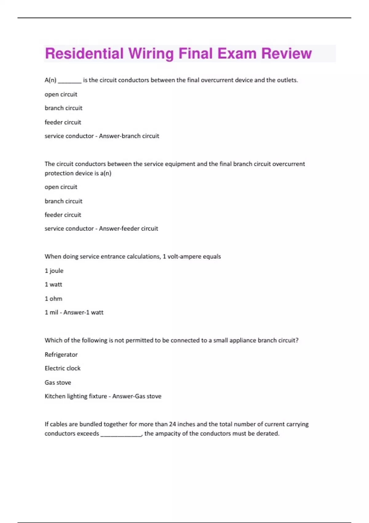 A(n) _______ is the circuit conductors between the final overcurrent device and the outlets. open circuit branch circuit feeder circuit service conductor - Answer-branch circuit The circuit conductors between the service equipment and the final branch circuit overcurrent protection device is a(n) open circuit branch circuit feeder circuit service conductor - Answer-feeder circuit When doing service entrance calculations, 1 volt-ampere equals 1 joule 1 watt 1 ohm 1 mil - Answer-1 watt Which of the following is not permitted to be connected to a small appliance branch circuit? Refrigerator Electric clock Gas stove Kitchen lighting fixture - Answer-Gas stove If cables are bundled together for more than 24 inches and the total number of current carrying conductors exceeds ____________, the ampacity of the conductors must be derated.2 3 4 5 - Answer-3 When doing a standard service entrance calculation, if a residence has 4 fixed appliances, a demand factor of _______% is applied to the total load of these appliances 50 75 80 100 - Answer-75 When doing a standard service entrance calculation and applying the demand factor to the total load of the general lighting load, the small appliance circuits, and the laundry circuit, the first _____ voltamperes are computed at 100% 2000 2500 3000 4000 - Answer-3000 A 200 ampere rated panel is designed and manufactured to accommodate ____ circuits 30 40 42 any of the above - Answer-any of the above Which of the following loads does not require a grounded circuit conductor? 2 wires, 120V 3 wires, 120/240V 2 wires, 240Vnone of the above - Answer-2 wires, 240V