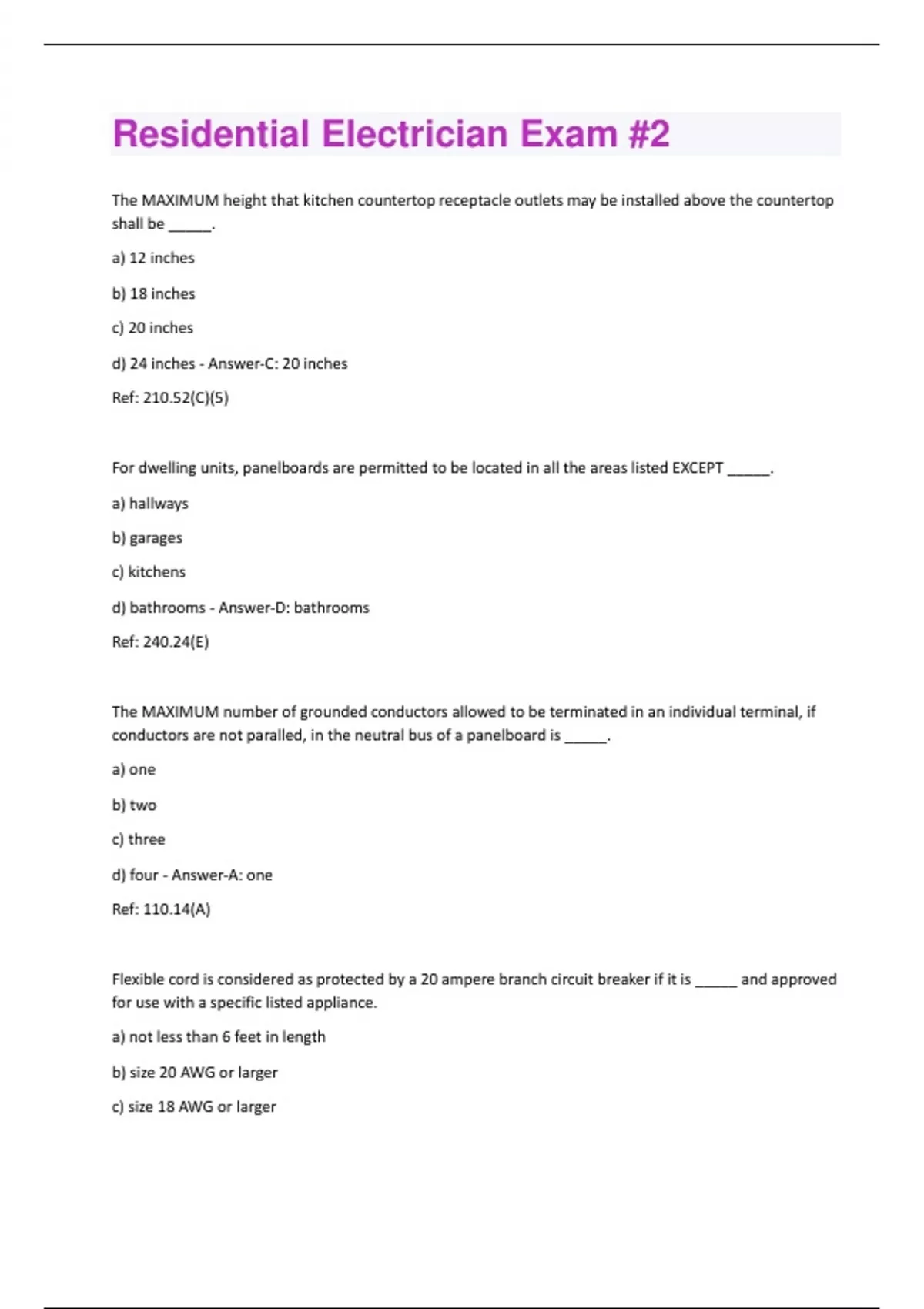 The MAXIMUM height that kitchen countertop receptacle outlets may be installed above the countertop shall be _____. a) 12 inches b) 18 inches c) 20 inches d) 24 inches - Answer-C: 20 inches Ref: 210.52(C)(5) For dwelling units, panelboards are permitted to be located in all the areas listed EXCEPT _____. a) hallways b) garages c) kitchens d) bathrooms - Answer-D: bathrooms Ref: 240.24(E) The MAXIMUM number of grounded conductors allowed to be terminated in an individual terminal, if conductors are not paralled, in the neutral bus of a panelboard is _____. a) one b) two c) three d) four - Answer-A: one Ref: 110.14(A) Flexible cord is considered as protected by a 20 ampere branch circuit breaker if it is _____ and approved for use with a specific listed appliance. a) not less than 6 feet in length b) size 20 AWG or larger c) size 18 AWG or largerd) size 16 AWG or larger - Answer-C: size 18 AWG or larger Ref: 240.5(B)(2) A 120-volt receptacle is installed on a dwelling unit kitchen island countertop that is 8 feet from the kitchen sink. Which one of the following statements, if any, is correct? a) GFCI protection is not required because the receptacle is not within 6 feet of the sink. b) GFCI protection is required for all countertop kitchen receptacles. c) GFCI protection is not required on receptacles installed on kitchen islands. d) None of the above is correct. - Answer-B: GFCI protection is required for all countertop kitchen receptacles. Ref: 210.8(A)(6) Where a mobile home has the main service disconnecting means installed outdoors, the disconnecting means shall be installed, so the bottom of the enclosure is NOT less than _____ above finished grade. a) 1 foot b) 2 feet c) 3 feet d) 4 feet - Answer-B: 2 feet Ref: 550.32(F)