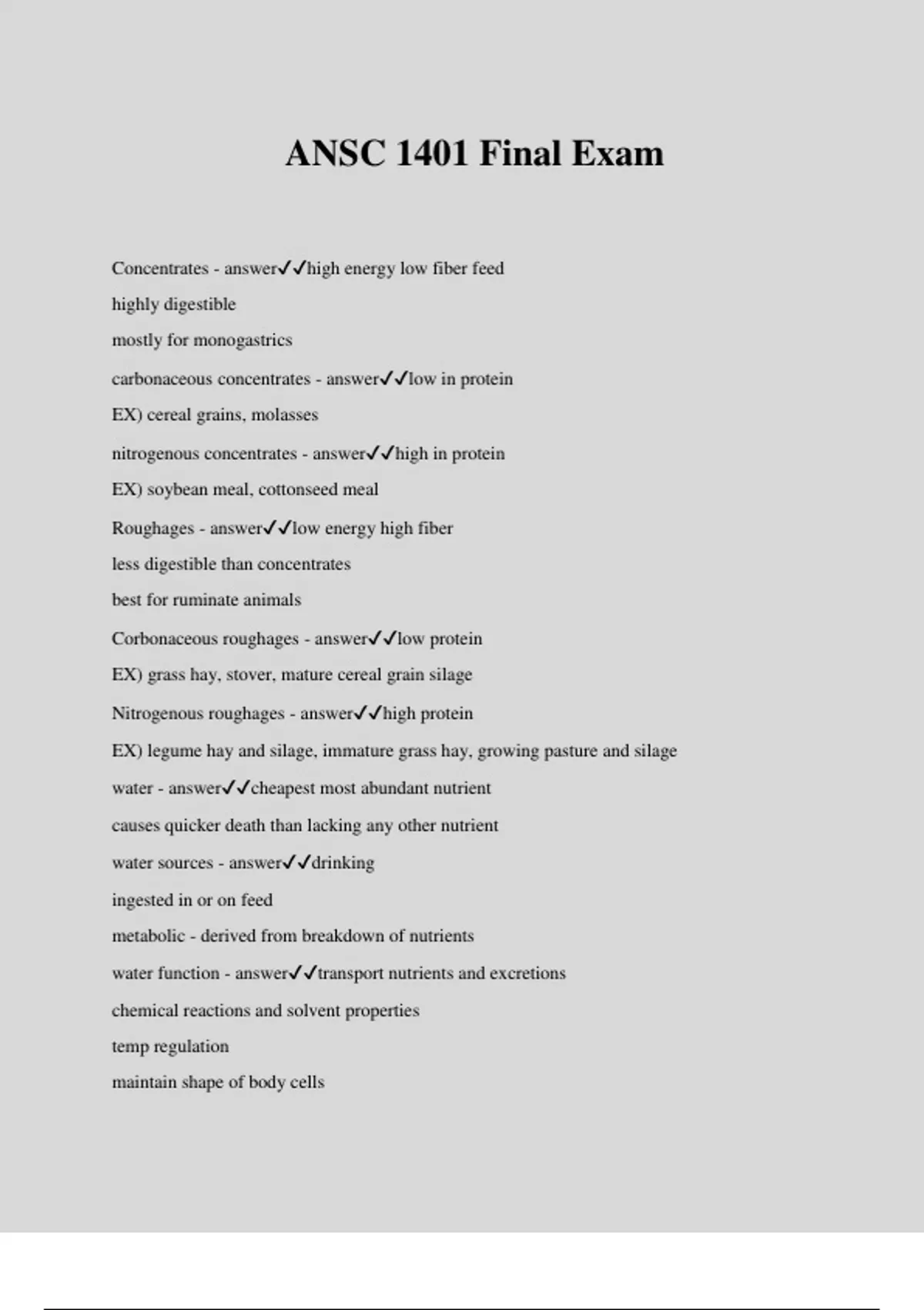 ANSC 1401 Final Exam Concentrates - answerhigh energy low fiber feed highly digestible mostly for monogastrics carbonaceous concentrates - answerlow in protein EX) cereal grains, molasses nitrogenous concentrates - answerhigh in protein EX) soybean meal, cottonseed meal Roughages - answerlow energy high fiber less digestible than concentrates best for ruminate animals Corbonaceous roughages - answerlow protein EX) grass hay, stover, mature cereal grain silage Nitrogenous roughages - answerhigh protein EX) legume hay and silage, immature grass hay, growing pasture and silage water - answercheapest most abundant nutrient causes quicker death than lacking any other nutrient water sources - answerdrinking ingested in or on feed metabolic - derived from breakdown of nutrients water function - answertransport nutrients and excretions chemical reactions and solvent properties temp regulation maintain shape of body cells lube and cushion joints and organs Protein - answercomposed of amino acids - 22 amino acids Protein structure - answeramino acids -- peptide--polypeptide--protein Essential Amino Acids - answerAnimal must have - must be through diet Essential Amino Acids - answerMethionine Arginine Threonine Tryptophan Histidine Isoleucine Leucine Lysine Valine Phenylalanine Nonessential Amino Acids - answerneeded but made in the body Protein Analysis - answerdetermine Nitrogen content then multiply by 6.25 1. Crude protein 2. Digestable Protein Nonprotein Nitrogen - answerurea, biuret Protein Function - answer4cal/g basic structure unit of animal body metabolism - enzymes, hormones, immune antibodies Energy source Photosynthesis - answerproduces carbs Monosaccharides - answerone sugar molecule