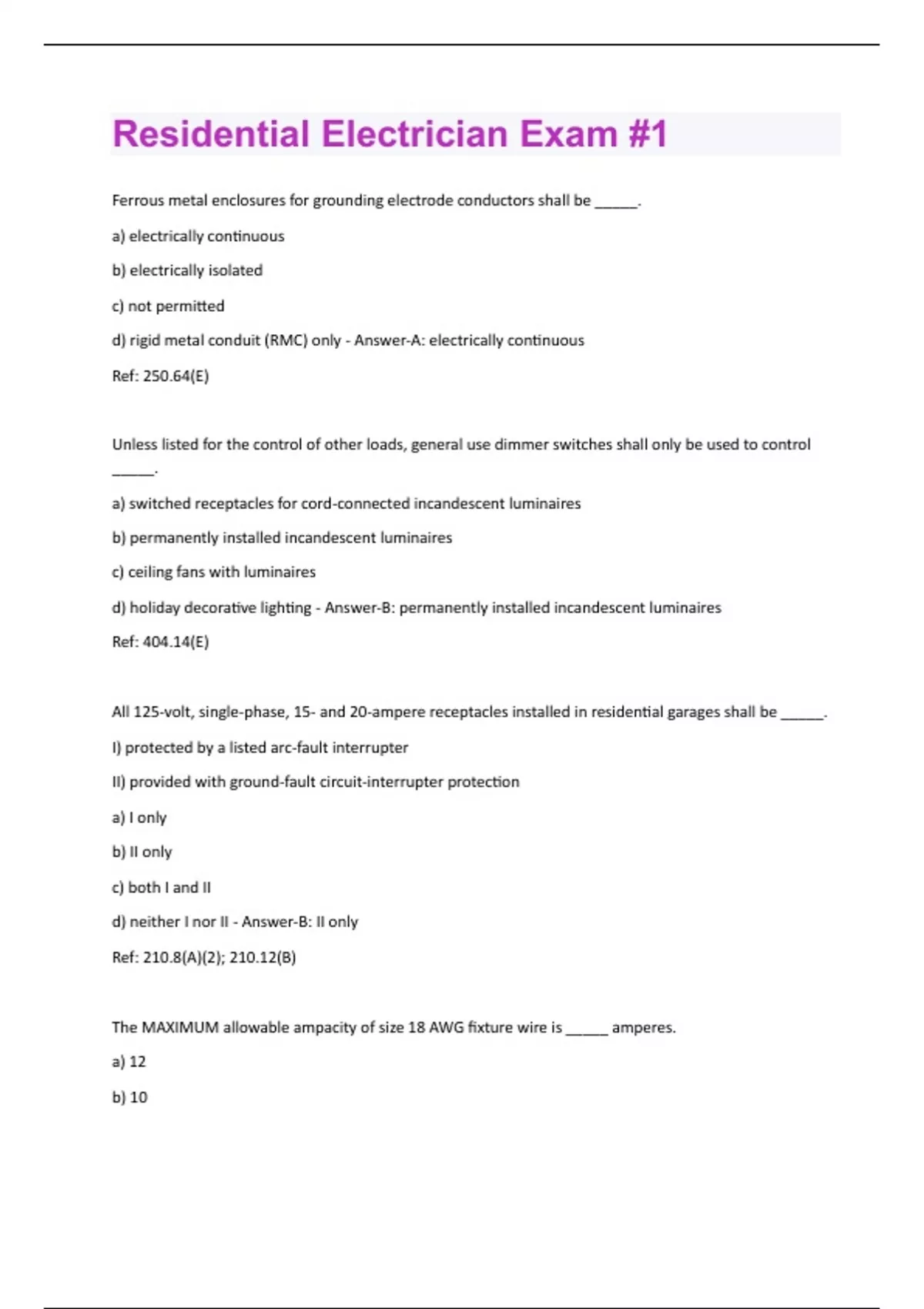 Ferrous metal enclosures for grounding electrode conductors shall be _____. a) electrically continuous b) electrically isolated c) not permitted d) rigid metal conduit (RMC) only - Answer-A: electrically continuous Ref: 250.64(E) Unless listed for the control of other loads, general use dimmer switches shall only be used to control _____. a) switched receptacles for cord-connected incandescent luminaires b) permanently installed incandescent luminaires c) ceiling fans with luminaires d) holiday decorative lighting - Answer-B: permanently installed incandescent luminaires Ref: 404.14(E) All 125-volt, single-phase, 15- and 20-ampere receptacles installed in residential garages shall be _____. I) protected by a listed arc-fault interrupter II) provided with ground-fault circuit-interrupter protection a) I only b) II only c) both I and II d) neither I nor II - Answer-B: II only Ref: 210.8(A)(2); 210.12(B) The MAXIMUM allowable ampacity of size 18 AWG fixture wire is _____ amperes. a) 12 b) 10c) 8 d) 6 - Answer-D: 6 Ref: Tbl. 402.5 A receptacle outlet installed for a gas or electric clothes dryer in the laundry room of a dwelling unit must be installed within at LEAST _____ feet of the intended location of the dryer. a) 6 b) 4 c) 10 d) 3 - Answer-A: 6 Ref: 210.50(C) Which of the following listed conductors are required to have overcurrent protection on a residential electric service? a) grounding conductors b) bonding conductors c) identified conductors d) ungrounded conductors - Answer-D: ungrounded conductors Ref: 290.9