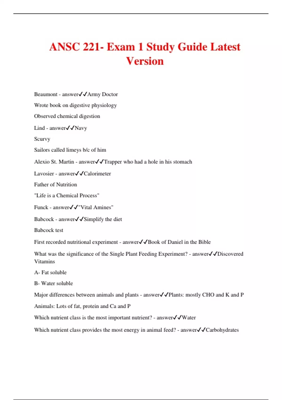 ANSC 221- Exam 1 Study Guide Latest Version Beaumont - answerArmy Doctor Wrote book on digestive physiology Observed chemical digestion Lind - answerNavy Scurvy Sailors called limeys b/c of him Alexio St. Martin - answerTrapper who had a hole in his stomach Lavosier - answerCalorimeter Father of Nutrition "Life is a Chemical Process" Funck - answer"Vital Amines" Babcock - answerSimplify the diet Babcock test First recorded nutritional experiment - answerBook of Daniel in the Bible What was the significance of the Single Plant Feeding Experiment? - answerDiscovered Vitamins A- Fat soluble B- Water soluble Major differences between animals and plants - answerPlants: mostly CHO and K and P Animals: Lots of fat, protein and Ca and P Which nutrient class is the most important nutrient? - answerWater Which nutrient class provides the most energy in animal feed? - answerCarbohydrates Which nutrient class has the most energy per gram? - answerFats Which nutrient class provides energy only after requirements are met? - answerProtein Which nutrient classes do not provide energy? - answerVitamins and Minerals Which nutrient class in analyzed as crude fiber and NFE? - answerCarbohydrates Which nutrient class is soluble in ether? - answerLipids Which nutrient class is analyzed by the Kiedahl procedure? - answerProtein (N) Crude Protein is equal to what? - answerN x 6.25 How much energy do fats have compared to carbs and proteins? - answer2.25 times more How much water loss is fatal? - answer12% What are the three sources of water? - answerDrinking water Water in feed Metabolic water What are the three properties of water that aid animal life? - answerHigh dielectric constant High latent heat of vaporization High specific heat What physical property of water helps cool a dog when it pants? - answerHigh latent heat of vaporization Which physical property of water helps move nutrients to cells? - answerHigh dielectric constant What are the major functions of water in animals? - answerMove nutrients and metabolites Maintain body temperature Aid in chemical reactions What are four of the consequences of too little water? - answerDecreased food intake Hemoconcentration Increase heart rate Death Why is water so good at maintaining body temperature? - answerHigh specific heat